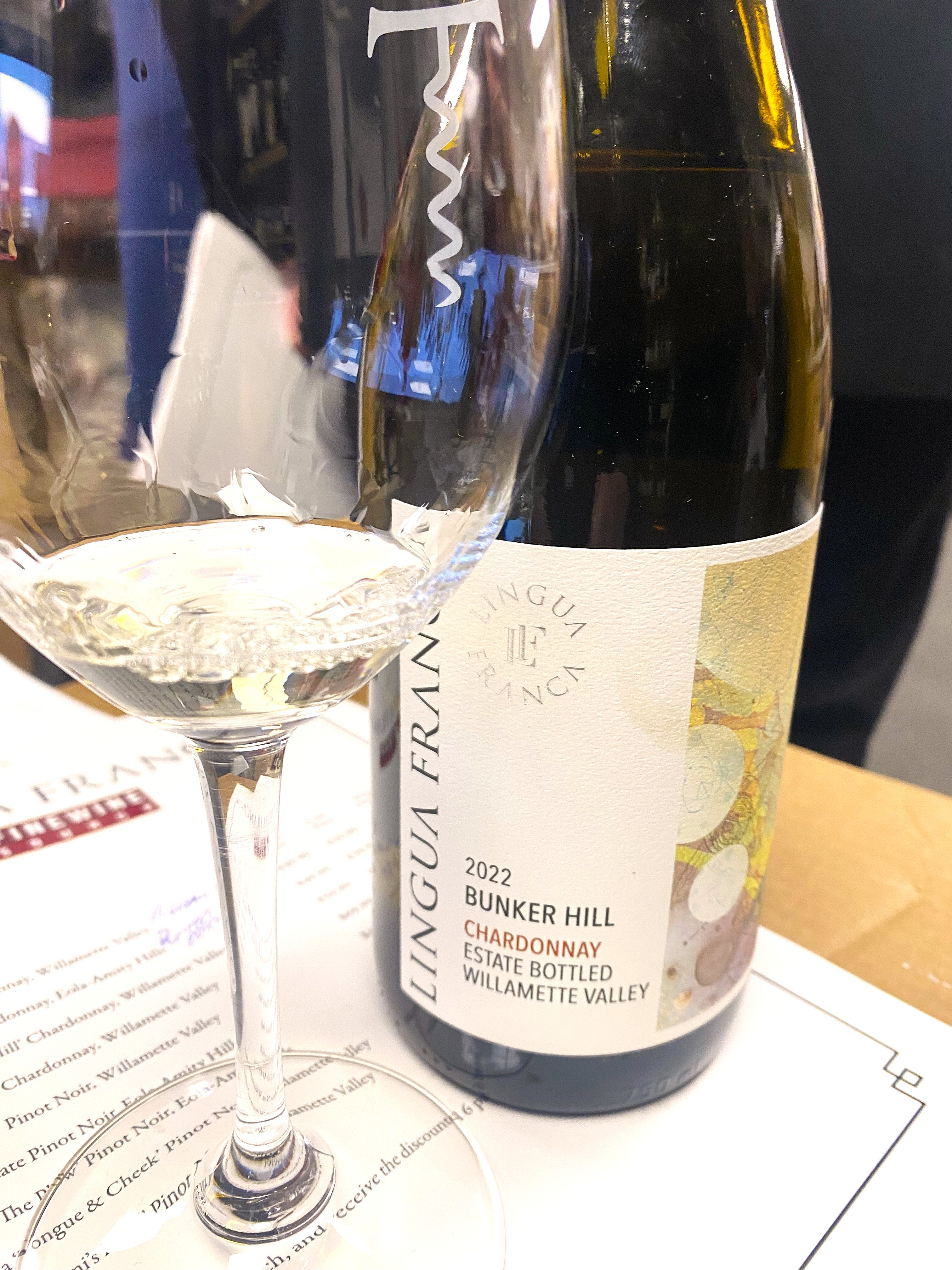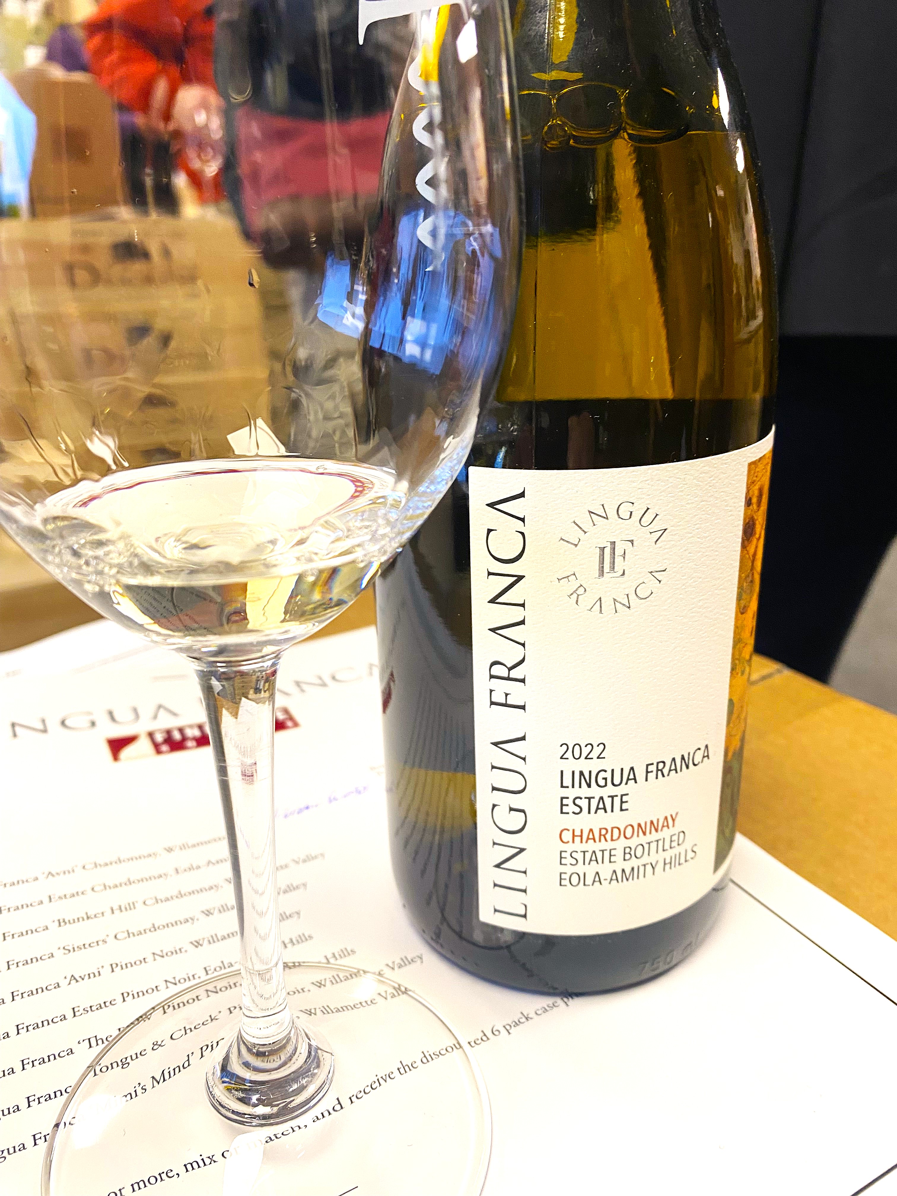 We then had the Lingua Franca Estate Pinot Noir Eola-Amity Hills 2022. The wine is pure Pinot Noir and most of the fruit for this wine came from two of their finest Blocks (1 and 2), while seventeen percent came from their Block 3 with slightly deeper soil and then thirty-one percent from their higher Blocks planted with a different clone. The fruit was hand-harvested and sorted, with the use of wild yeast fermentation in medium-sized concrete and Stainless-Steel tanks. Nineteen percent of the fruit was done in the whole cluster and the balance destemmed and only whole berries. The Initial Fermentation and the Malolactic Fermentation were both done spontaneously, followed by traditional punch-downs. The wines were aged for twelve months in French Oak, of which twenty-five percent was new, then the wines were blended for an additional four months in a tank before bottling. This deep ruby-red wine offered notes of cherry, raspberry, blackberry and pomegranates along with lavender and spices. On the palate this medium-bodied, well-balanced wine displayed tones of red fruits and citrus with bright acidity and ripe tannins ending with a medium-to long-count finish of fruit and terroir.