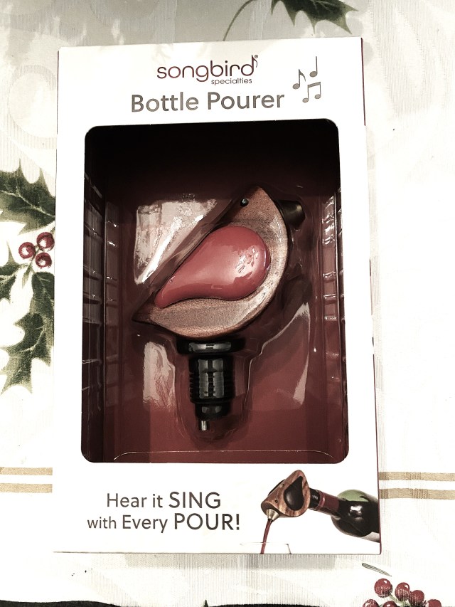 The last item is from “Songbird Specialties” and it is a Bottle Pourer and the accompanying message on the package is “Hear it SING with Every POUR.” I haven’t tried it out yet, but I guess it is a type of aerator, and it may be very popular at her next Annual Ladie’s Party. My Bride is very fond of cardinals, birds and not the team. We have several cardinal appearances, both as decorations in the house, as well as outside of the house as well.