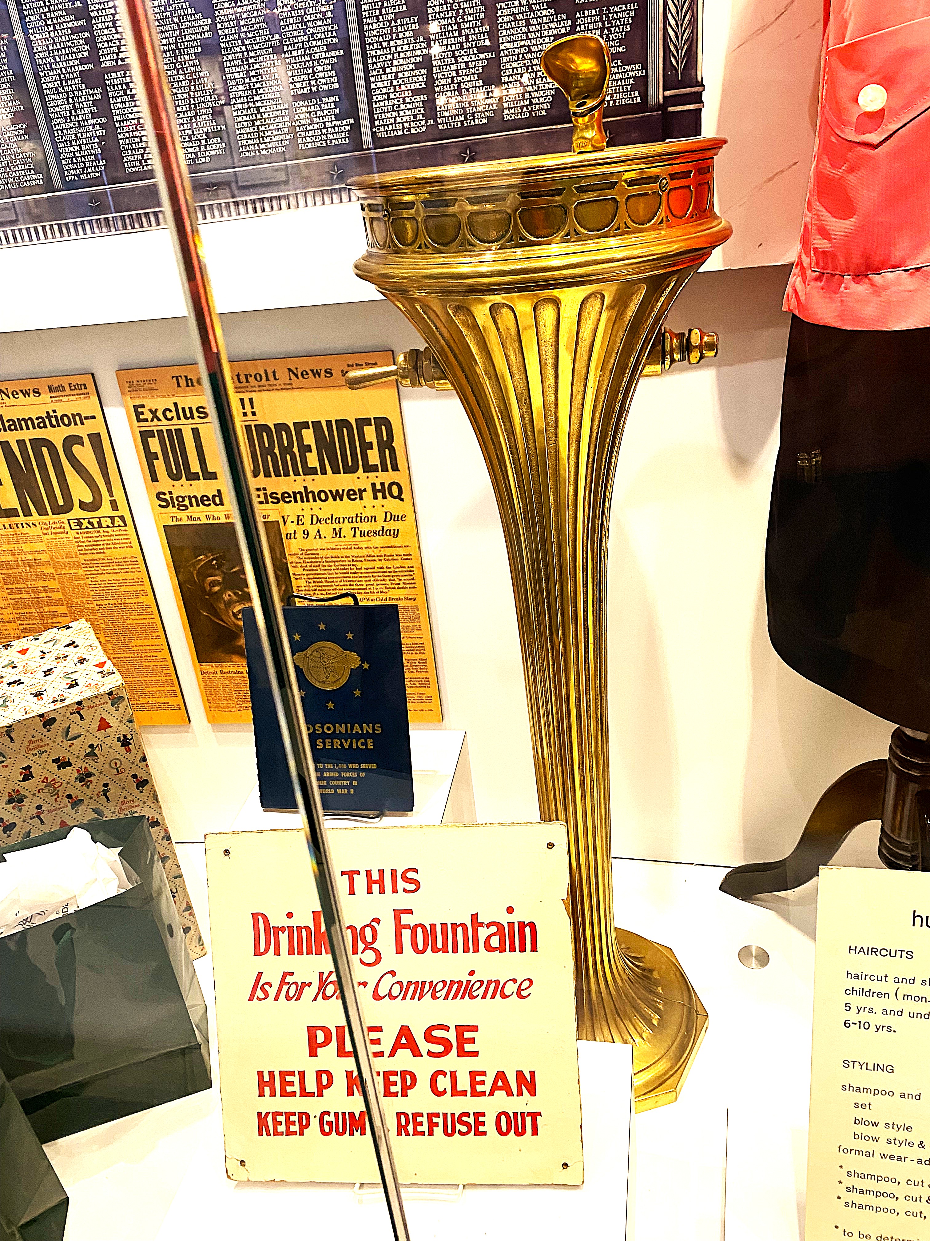 J L Hudson Company was founded in 1881 and at one time was the second largest department store in square footage, and it was the tallest department store in the world, with twenty-five stories and encompassed an entire city block. At one time they also produced automobiles, which became part of American Motors Corporation and later Chrysler and now Stellantis. I remember shopping there as a child with my mother, and she would park in a structure across from the back side of the building and at that time there was still a doorman at that entrance. They had beautiful bays of elevators of copper, brass and wood, with elevator operators that announced the products on each floor, or you could use the escalators that were found at several locations on each floor. Somewhere in the house, I still have my mother’s original metal “key ring” charge plate, which was later reissued in plastic, and I would marvel at the labyrinth of pneumatic tubes that would go from a cash register to a central location for approval and then would return in the tube, totally impressive, especially to a child. I remember that my mother would also call the credit department when I was a little older, and they would issue me a temporary one-day cardboard card good for a couple of hundred dollars, so that I could do my Christmas shopping. Since I was still young, and traveled by bus, it was no problem as Hudson’s had a huge fleet of dark green delivery trucks that would deliver all purchases on certain days, depending on the district of the city where one lived. The exhibition at the museum touched upon all of this, and they even had one of the wonderful brass water fountains that were located everywhere in the building. When they announced that the store would be closed and later imploded, I always thought a water fountain would be a great memento, but it was not for me to have; and yes, I guess I am a strange guy and even a kid earlier on.