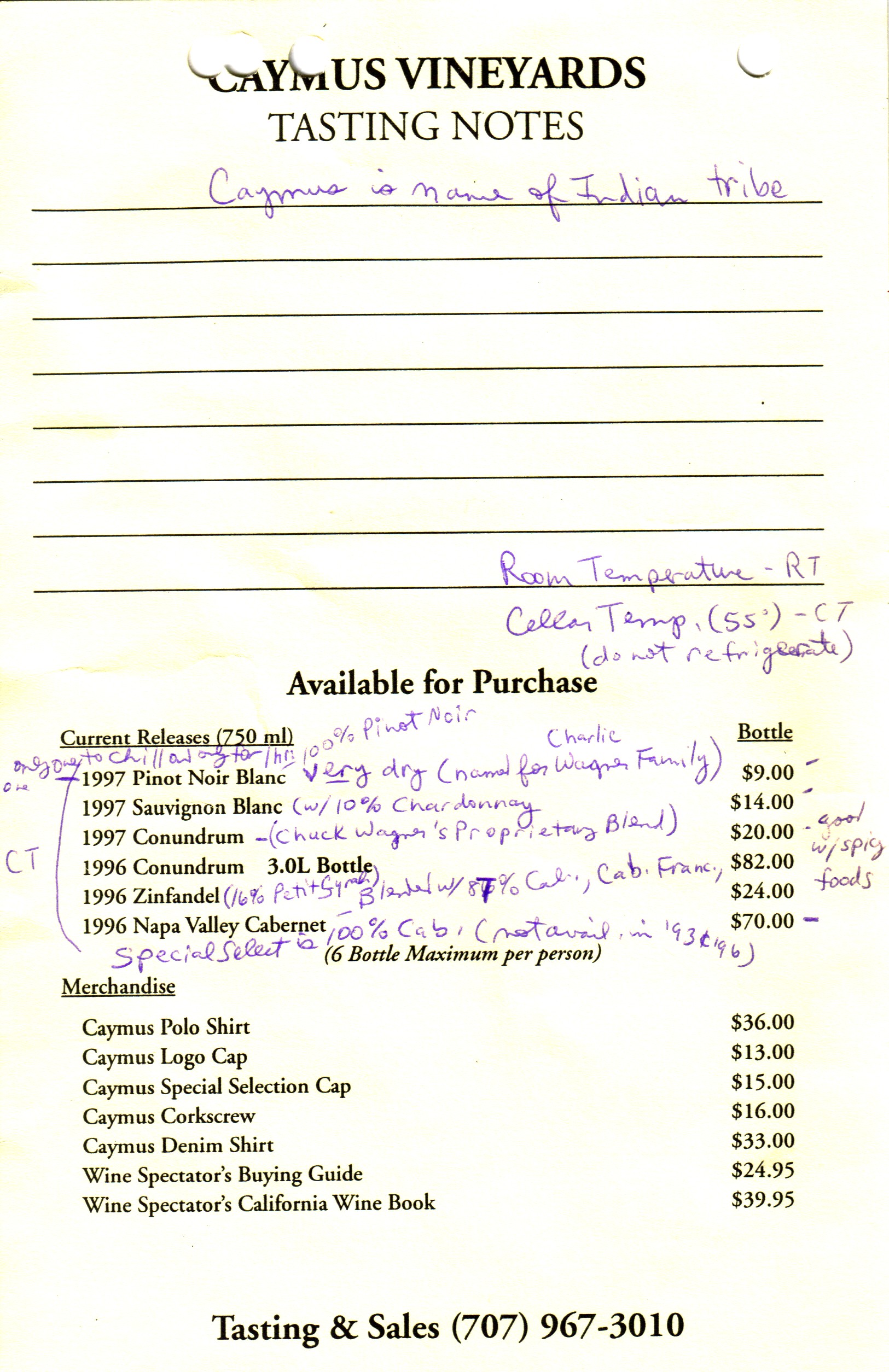 They started of with a 1997 Pinot Noir Blanc, which was 100% Pinot Noir and it was very dry and very pleasant. Prior to getting to the winery, I only knew that they made a Cabernet Sauvignon (I guess I should have done more homework for the trip). Then they served a 1997 Sauvignon Blanc with 10% Chardonnay that had a lush taste for this type of wine, that sometimes seems lacking with some vintners. I recently checked their current offerings, and these first two wines are not being produced any more at the Caymus Winery.