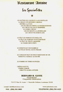 When I was still young I remember an advertisement for an instant coffee which claimed they substituted their coffee for the legendary coffee of Antoine’s in New Orleans.   Back then I had no idea of Antoine’s, but I was still incredulous that a stellar restaurant could pull such a switcheroo and why they would want to.  Now I know what Antoine’s is, and I still find the commercial hard to take.
