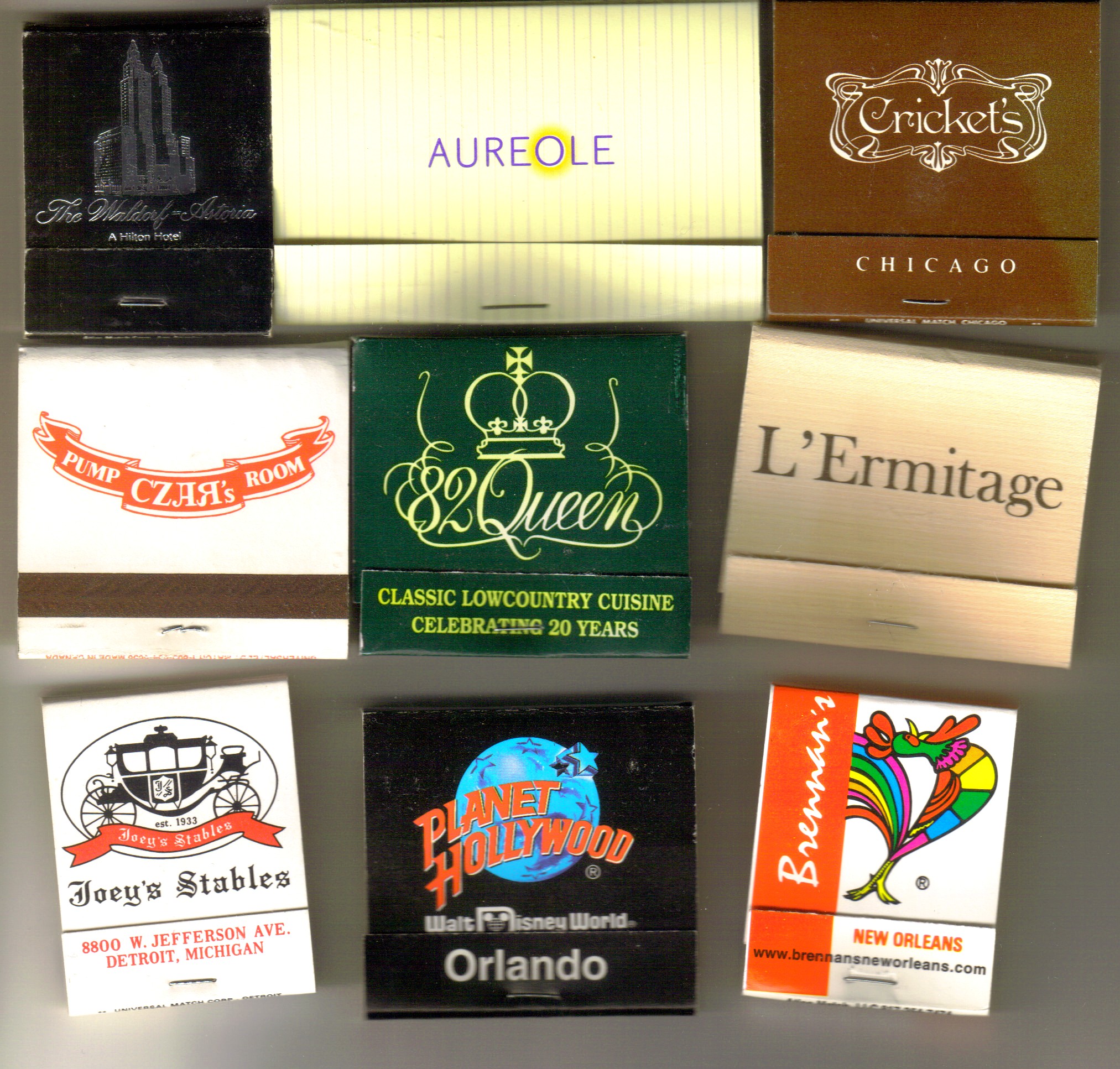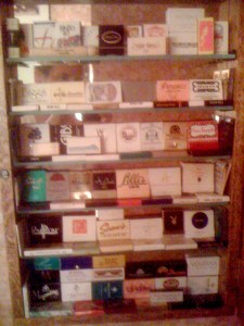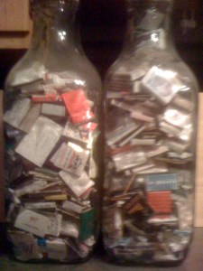 This brings me to another visual aid that I have used and will probably use again in the future – Match Books. I lament that most restaurants no longer advertise on a match book. In this day and age of political correctness and whether smoking a cigar on a golf course is harmful to someone else’s health; match books and the era that they came from are gone. My Bride and I collected these curios as keepsakes, the same way we have kept them from weddings that we have attended. Some restaurants have tried to maintain the tradition by furnishing a “matchbook” or “match box” of toothpicks. Of course I have collected some of these as well. We have a display case in our downstairs powder room filled with some match books of places that we loved, that are no longer around, as well as some places that we frequent, as well as some places that are still going concerns that we may have only visited once. In our dining room are two large mouth one gallon bottles that are filled with other match books from our dining and holiday experiences.