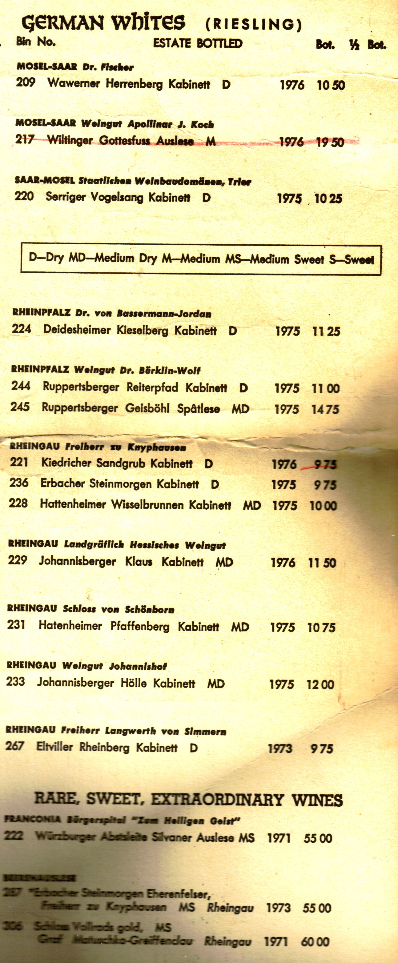 The menu and wine list is much too big for me to scan and show in one piece. I have scanned some of the wine list from the back side of the document, so that we can all drool over what a five star restaurant was charging for great wines in that day. If only we the prices would still be like these. So enjoy the visuals.
