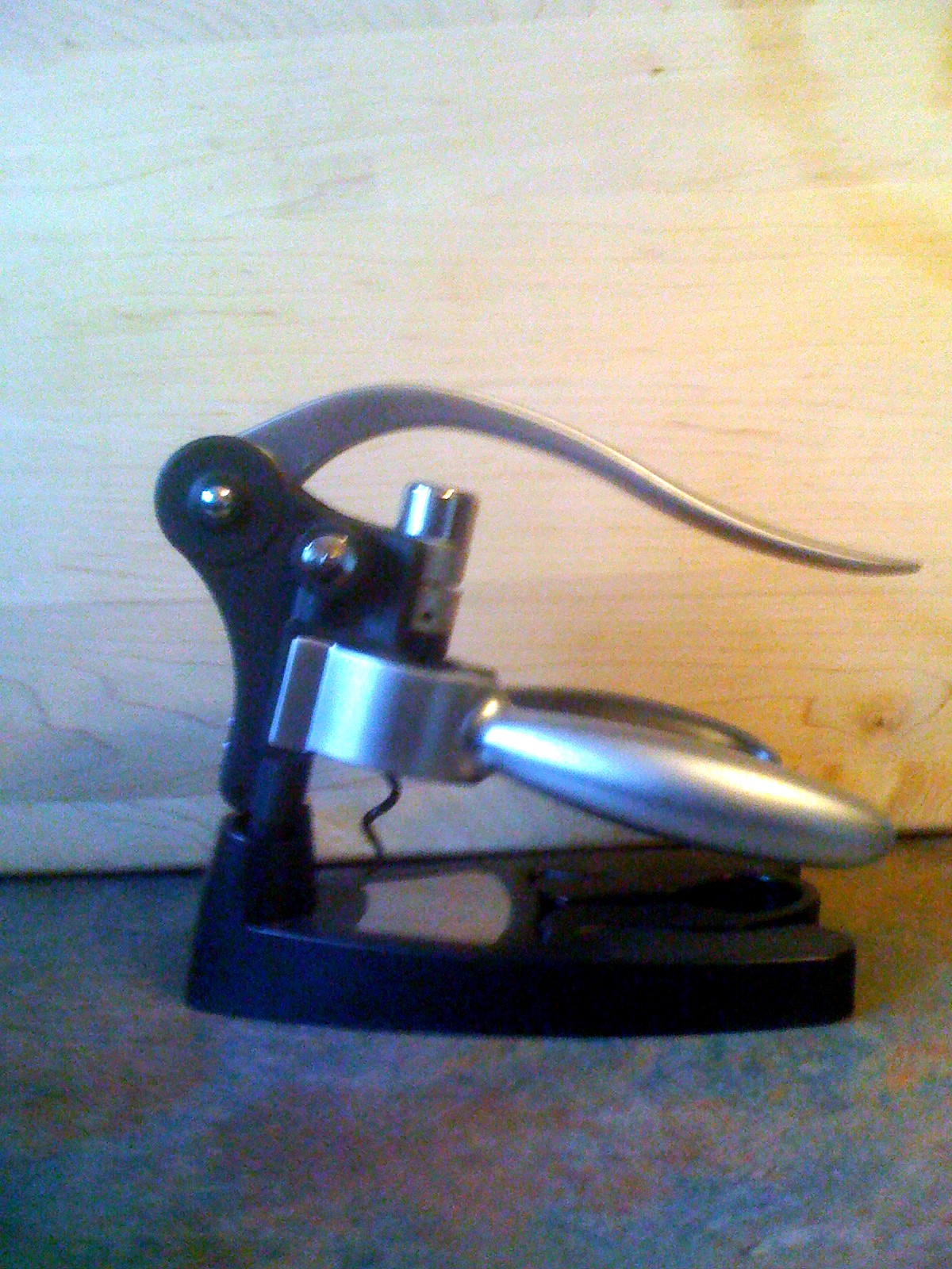 Over the years, people have stated that I am a hard person to buy a gift for, I do not see it, but perhaps they are right. So over the years I as well as my Bride have been recipients of assorted wine gadgets and gizmos. I am thinking of one of the most important items, other than wine, that someone that enjoys wine should possess and that is a corkscrew. It is very difficult to enjoy a bottle of wine without one, unless you have a screw cap enclosed bottle. One of oldest and best cork screw relies on brute strength, because once you screw it into the cork, you must manually pull the cork straight up out of the bottle. We have also received this wonderful huge table top cork screw that used to be in a restaurant, which requires very little work, but a large area to use it, because of its size.