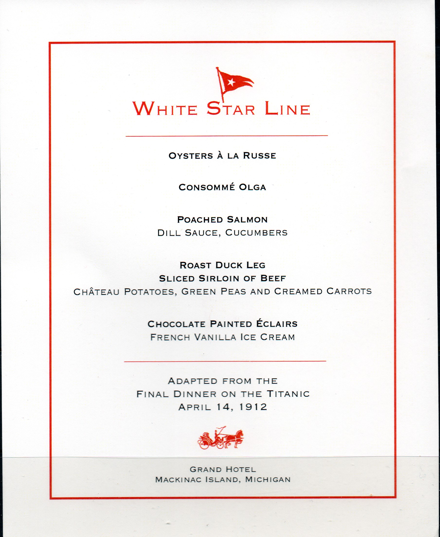As the reception was winding down, we were led into the “dining room” of the “Titanic” for our final meal of the event. There was some misinterpretation of the menu, as people were expecting an eleven course meal for the evening, but the selections were pared down to a manageable five courses, adapted from the final dinner of 14 April, 1912. From talking to some of the guests and some of the cast members, the first time this event was held, all eleven courses were served and dinner, did not finish until one o’clock in the morning. That first event did not please the guests or the hotel with the results and the menu was adapted to a more serviceable meal.