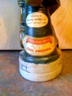 The third ceramic wine bottle which also has the cork intact with the wine enclosed is of an inebriated Fiddler with one hand holding a Wicker Chianti bottle while he is trying to keep a lamp post erect. The label on this decanter says Vino da Tavola Rosso which just translates to as Red Table Wine. There is also an importer’s label of the General Trading Company of Detroit, Michigan. I could not find any information about this wine distributor.