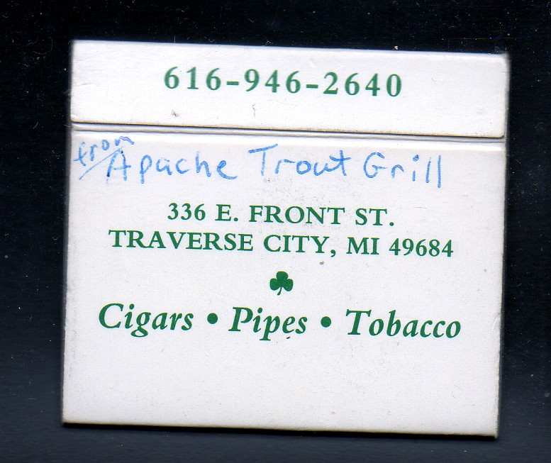 I was allowed to tag along with my Bride, on one of her many trips to this area for a conference, which is also a big business up there as well. At some of the conferences, not every night is a dinner en masse, so groups of friends go out and discover new little gems, to discuss the next day and the months after. I have the good fortune to know people that have summer residences in this part of the state, and they always wish to talk about a “hot” restaurant that they have already dined at, and I have always listened and taken notes. On one of the trips a group of us went to Apache Trout Grill in Traverse City, which has the ambience of a rustic lodge that Hollywood would have created for a set. It is a beautiful restaurant on the water, and the charming atmosphere that any restaurant would aspire to, especially in Traverse City. I must insert a caveat that the match book that I am showing, when I asked for some matches they brought me this box, but the matchbox is actually from a tobacconist in Traverse City. Fish is a natural entrée when one is in Northern Michigan and a restaurant called Apache Trout Grill certainly takes advantage of the Great Lakes. There was a small group of us there one evening, and everyone was ordering plates of fish and even though one of the standards of this restaurant is Short Ribs, I refrained and followed the crowd as we had a feast of seafood. We all shared each other’s appetizers, as well as trying the different choices of fish, and each of us ordered a different plate, just for that reason. It was a wonderful choice for the evening, and we started the night early, as they do not take reservations, as I recall. To us that just means getting there early and starting good times and memories a little earlier, rather then later; because sometimes a head start just makes the evening last longer.