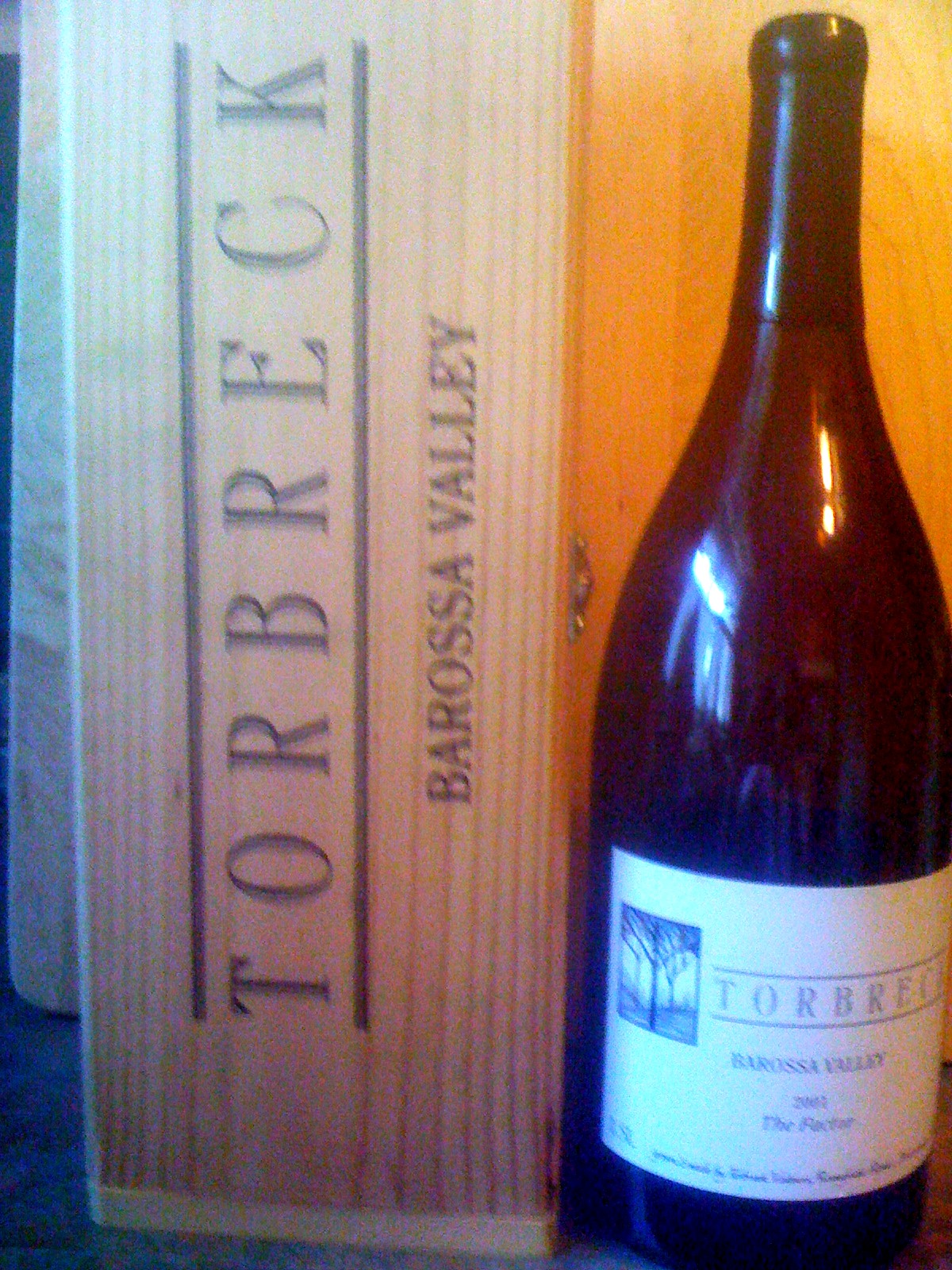 As I sit here looking at a wooden box which is my temporary muse, that at one time held a magnum of wine this is another story. The marketing of magnums especially in individual wooden wine boxes, I think is a great plus, while it may add a small cost to the total package, I do believe it proclaims to the customer that yes, this wine should be taken seriously. The wine was a Torbreck “The Factor” 2001 from the Barossa Valley in South Australia. Torbreck Vintners, the winery was founded by David Powell in 1994 and he signed the back label of the magnum near the numbering of number 195 out of a count of 240 magnums that were bottled of this wine. Mr. Powell named his winery after the Torbreck forest in Scotland. The wine “The Factor” was his homage to the great old Shiraz vines of the Barossa Valley and one of the mainstays of most of the wineries of this area. The manager on a Highland estate is referred to as “The Factor,” hence the proprietary name. This particular varietal grows well in several parts of the world, but I must say that Australia has been a big promoter of this type of wine, and now other areas have also had great results with it as well. One of the reasons that this wine is so full and rich in flavor is that it spent twenty-four months in French Oak barrels with thirty percent of them being new. This is not a wine that was made for quick consumption, as the nuances and traits of these old vines were allowed to mature in the barrels properly. Torbreck Vintners also produces several other varietals as well as some other “named” wines.