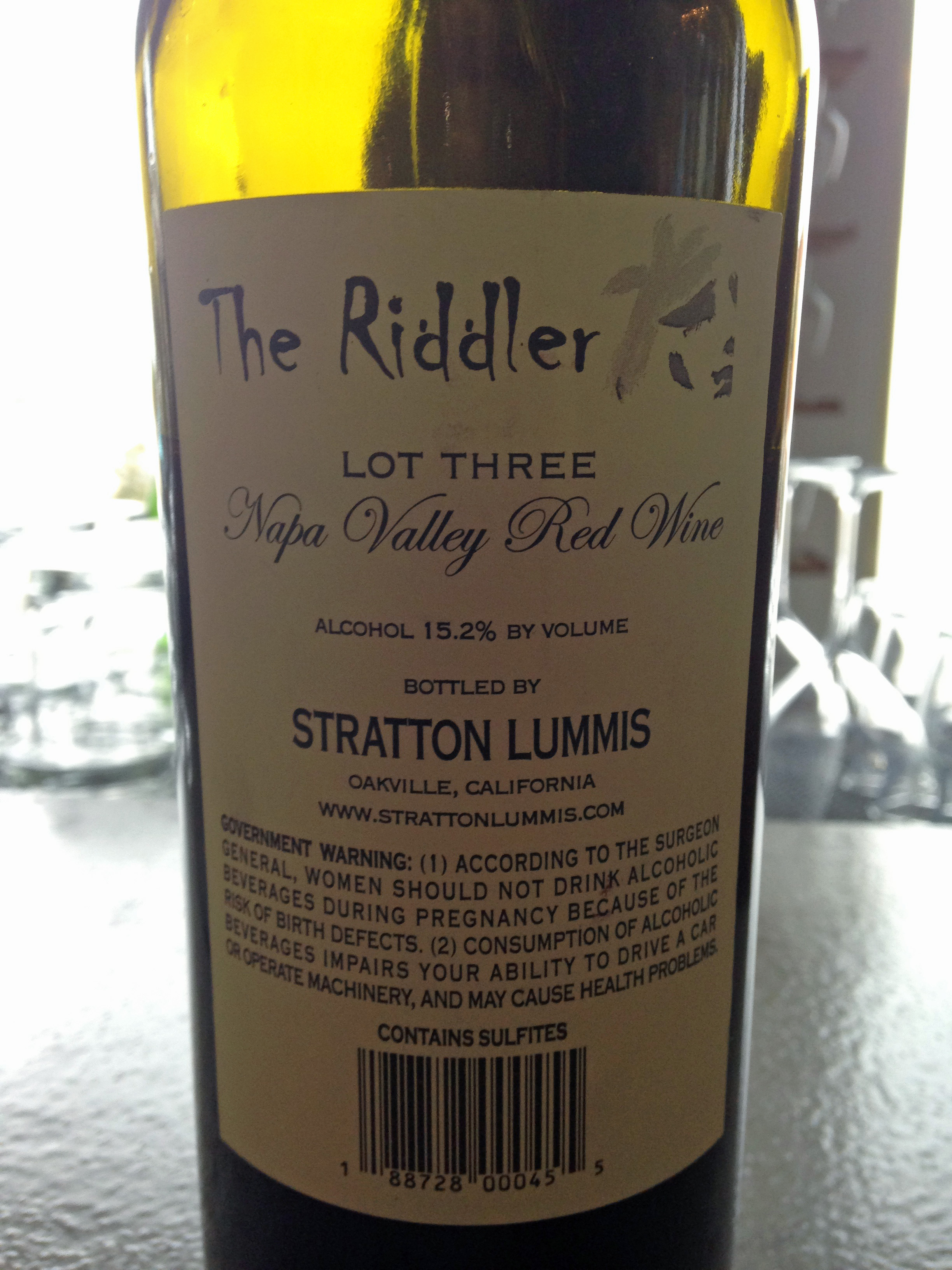 The wine I chose was Stratton Lummis “The Riddler” Lot Three NV from the Napa Valley. This was a blended red wine, but certainly not a Meritage, but it was a very smooth and enjoyable wine. It was a blend of Petite Syrah, Cabernet Franc, Syrah, Tempranillo Charbono, Zinfandel and Petit Verdot. A veritable Heinz 57 of wines, but the wine master did a fine job of blending these different varietals into a harmonious blend.