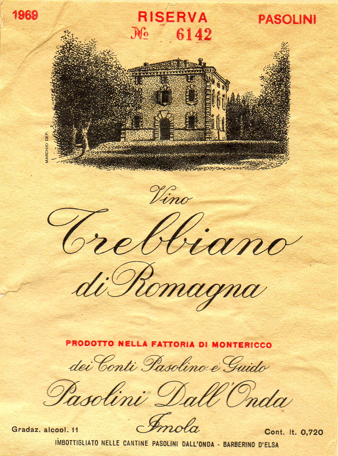 All of this food was accompanied by beer, cases of Molson Canadian Beer, the beer of choice in our house, as the family had come over from Ontario. There would also be wine, usually jugs of Italian red wine, sometimes home-made and sometimes store bought. I remember one of the dinners I brought two bottles of Italian white wines that I had bought, because I was in that early discovery mode, tasting all types of wines to find what I liked and did not like. When I brought out these two bottles of wines, there were questions of my man-hood bandied about (all in jest), because red wine was the only wine that was usually consumed by all, but there were some willing to try these wines brought in by this young heretic. These were both white wines from the same district of Italy, the Romagna and both were reserve wines from the same producer Pasolini. I had brought a bottle of Albana di Romagna 1969 and a bottle of Trebbiano di Romagna 1969. Albana was one grape varietal from the region and I noticed that on the label it had DOCC indication, which in hind sight I find curious as officially it was not recognized until 1987. The Trebbiano is another varietal and this label has no indication of DOCC and yet it was granted in 1973, which to my way of thinking should have been the label with DOCC on it, as they were closer to the actual date. Trebbiano is the Flagship varietal for this region for white wines. I do recall getting vindication after dinner from those that tried the wines and enjoyed them, from the others that did not, my sanity was still in question, but those were younger days and fond memories.
