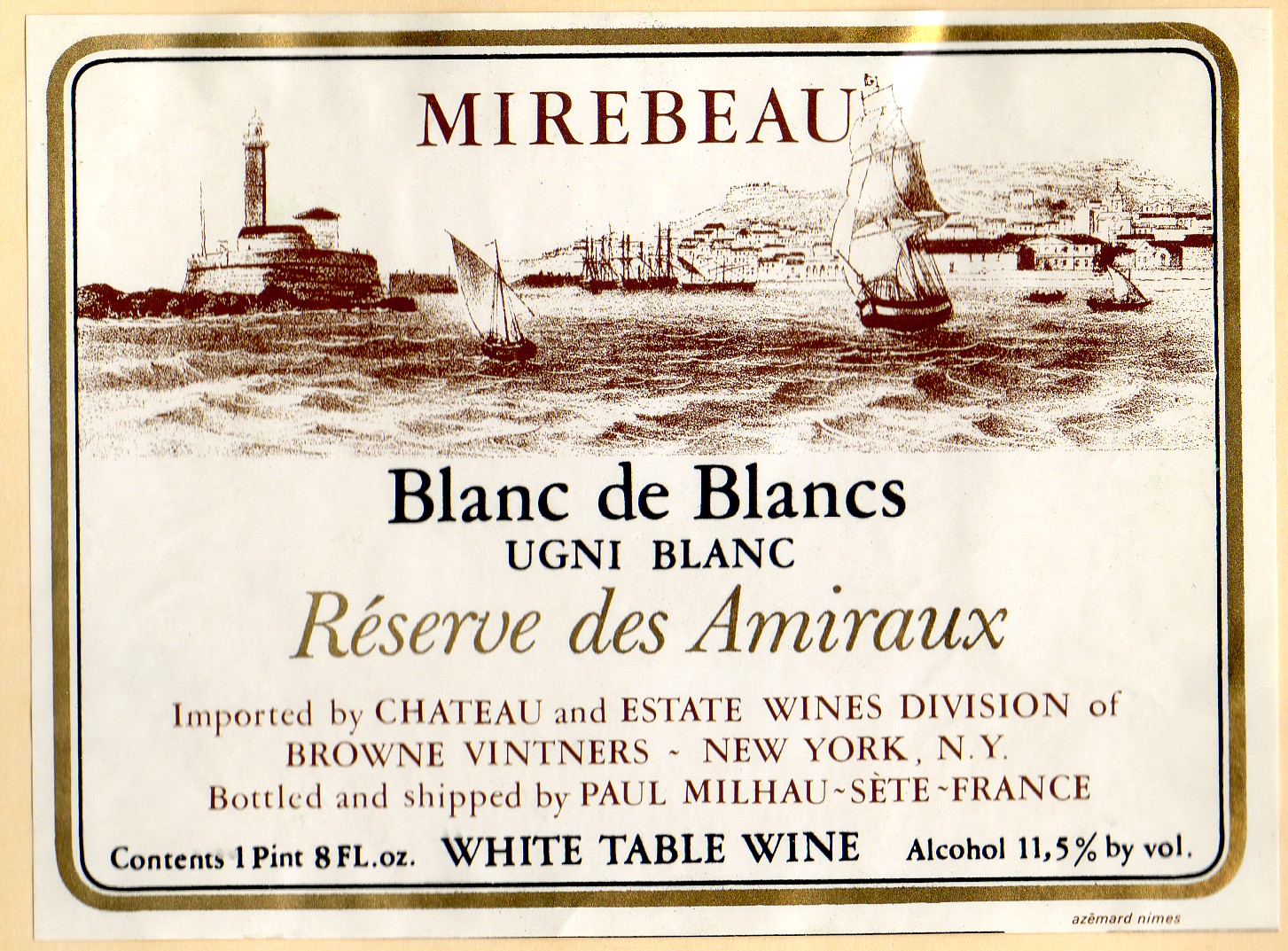 The first wine that I will discuss was a white wine; Mirebeau Blanc de Blancs Reserve des Amiraux. One of the earliest discoveries I had about wines that were not rated wines as in the famed wines of the Medoc, was that they would have sometimes have fancy names. Reserve des Amiraux loosely translates for me as Reserve of the Admirals (or Admiralty) which has no real meaning for wines, but it does sound very impressive. This wine was a Blanc de Blanc which I understood to be a white wine, and it also listed Ugni Blanc as the grape varietal. Ugni Blanc is more commonly known as Trebbiano, and may be one of the most widely planted grapes in the world and used for local or table wines everywhere. It is not a stellar varietal compared to some of the other grapes that are touted on wine labels, but it is usually fresh and fruity, especially if it is drank young. I remember that this wine was not so popular at the family gathering, but then anytime I brought a white wine, my brain was questioned, as red wine was the norm at these occasions.