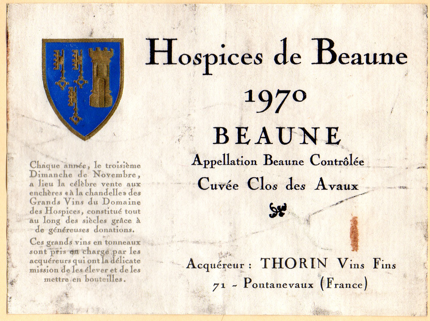 I have had only one bottle of the Hospice de Nuits 1er Cru Cuvee Grainger 1969, and from the vintage you can see that I had it very early in my learning career. I have had a couple different Hospices de Beaune wines; they were also from the same period. I am showing a bottle of Hospices de Beaune Cuvee Clos de Avaux 1970, which is a Premier Cru of Beaune.