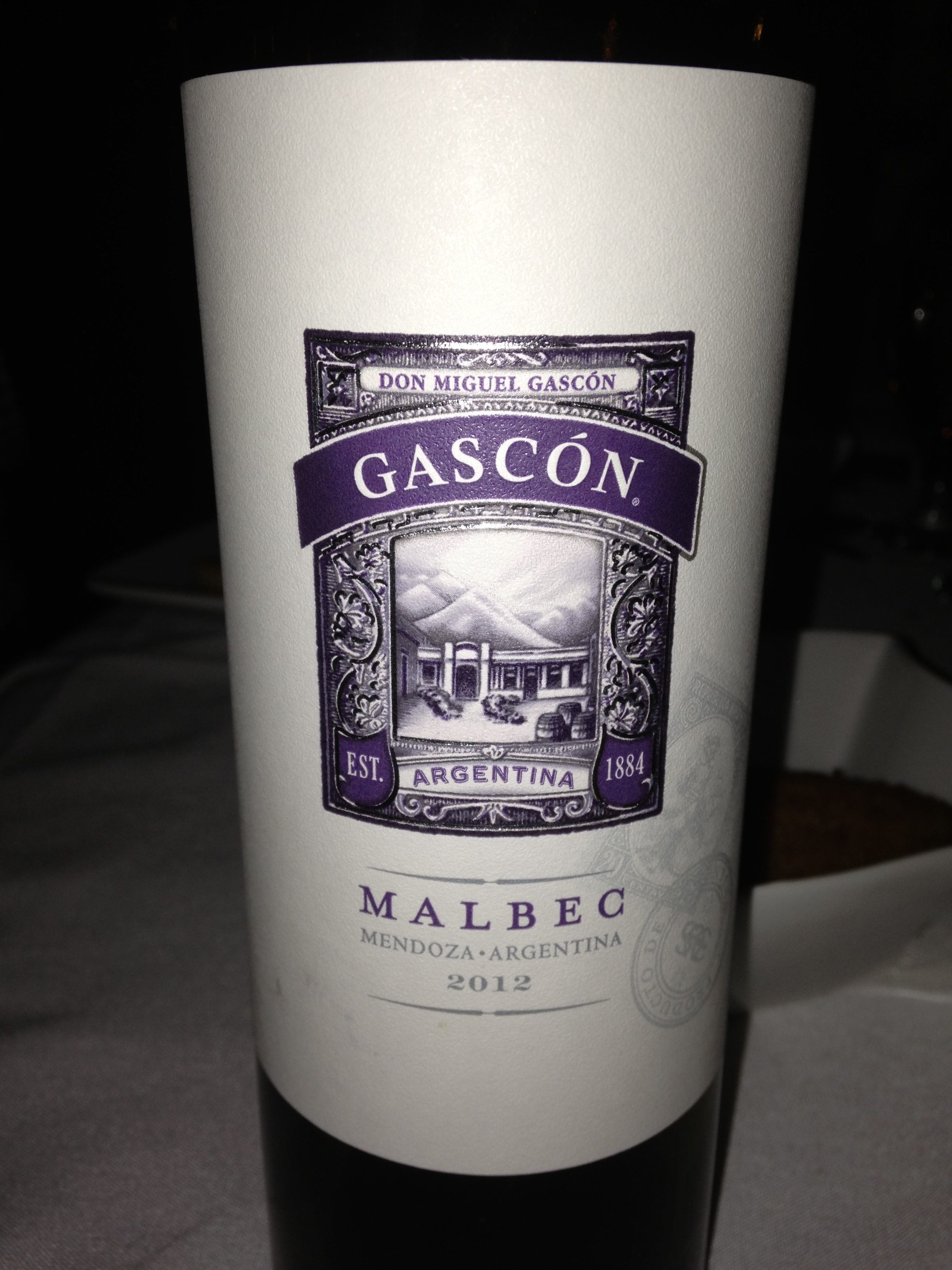 I was looking at the wine list, which was quite ample and there were some very interesting reds from South America. When our host appeared, he asked to look at the wine list and was going to order Cabernet Sauvignon, but he asked me my opinion as the other man only drank soft drinks. I suggested that since the theme of the restaurant was Argentine, with the name of Gaucho, I suggested a Malbec from Argentina or a Carmenere which originally was one of the grapes used in blending in the Medoc, but has flourished and excelled in Chile. Our host selected a Gascon Malbec 2012 from the Mendoza region, which accounts for about 80% of the wines from Argentina. This was a good wine, made for immediate consumption, but I do think that perhaps a more robust wine would have been a better compliment to all of the meats, but that is a minor aside and the wine worked well for the evening.