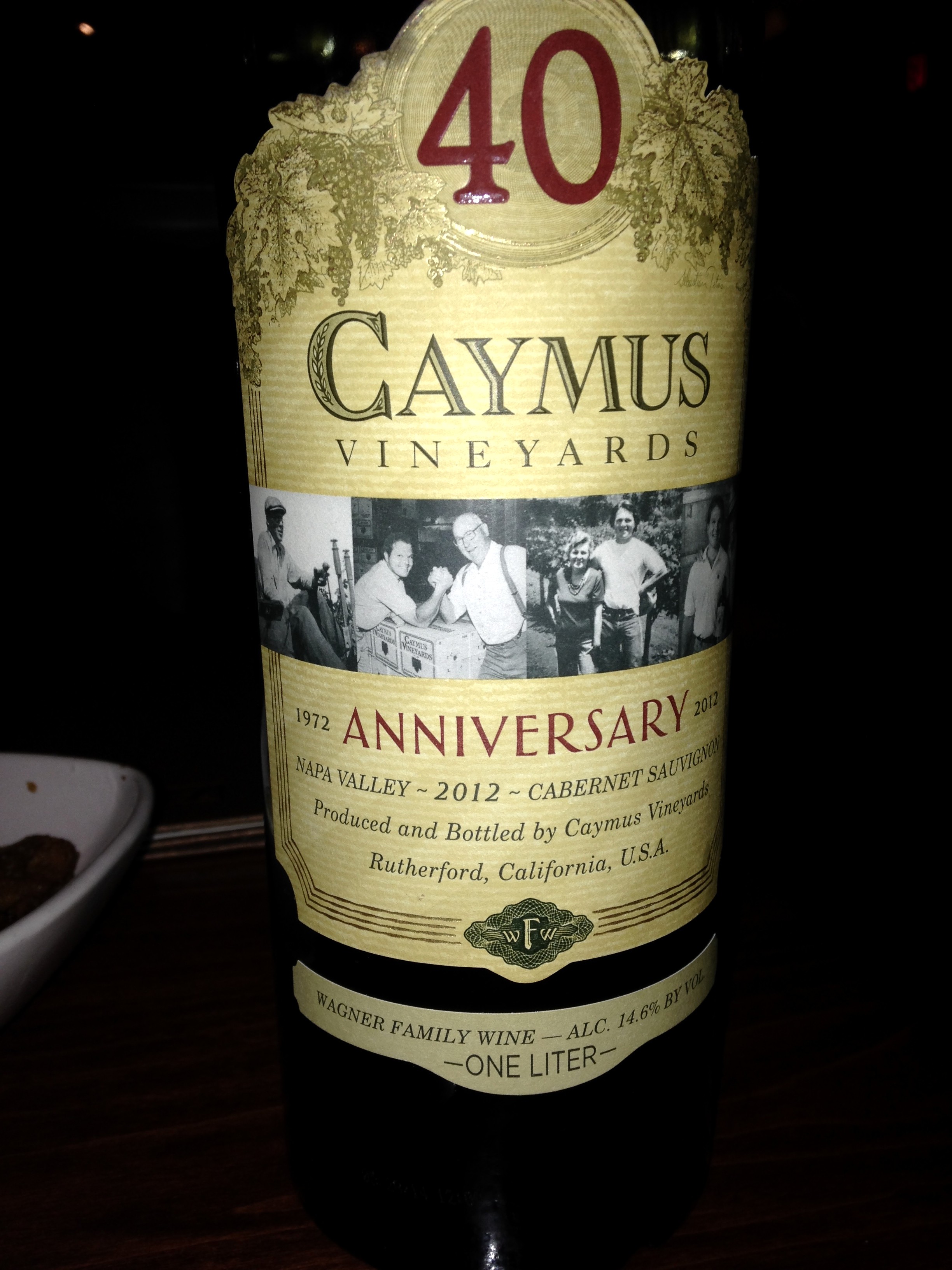 My Bride much to my amazement wanted to have a cocktail instead of a glass of wine, because there was a “Blueberry Lemon Drop” being offered that she thought sounded intriguing, but it was a little bit tarter than she expected. I started off with a glass of Terranoble Sauvignon Blanc 2013 from the Central Valley of Chile. The Central Valley is the largest appellation for Chile and the most lax; it is like the California appellation. Afterwards I had a wonderful glass of wine that was bundled with my burger, and I did not even notice the signage on the booth table, but my Bride did, and I am so glad that she did. I was enjoying a glass of Caymus Cabernet Sauvignon 2012, which celebrates Caymus Vineyards Fortieth Anniversary in the wine business. It was a deep inky wine that was truly enjoyable, not as heady as their Special Select, but a good glass of Cab and not nearly as pricey as the Select is, as well. All in all, for a quick bite for dinner, it was a wonderful meal and I do look forward to the next time we go there, and I am sure we will.