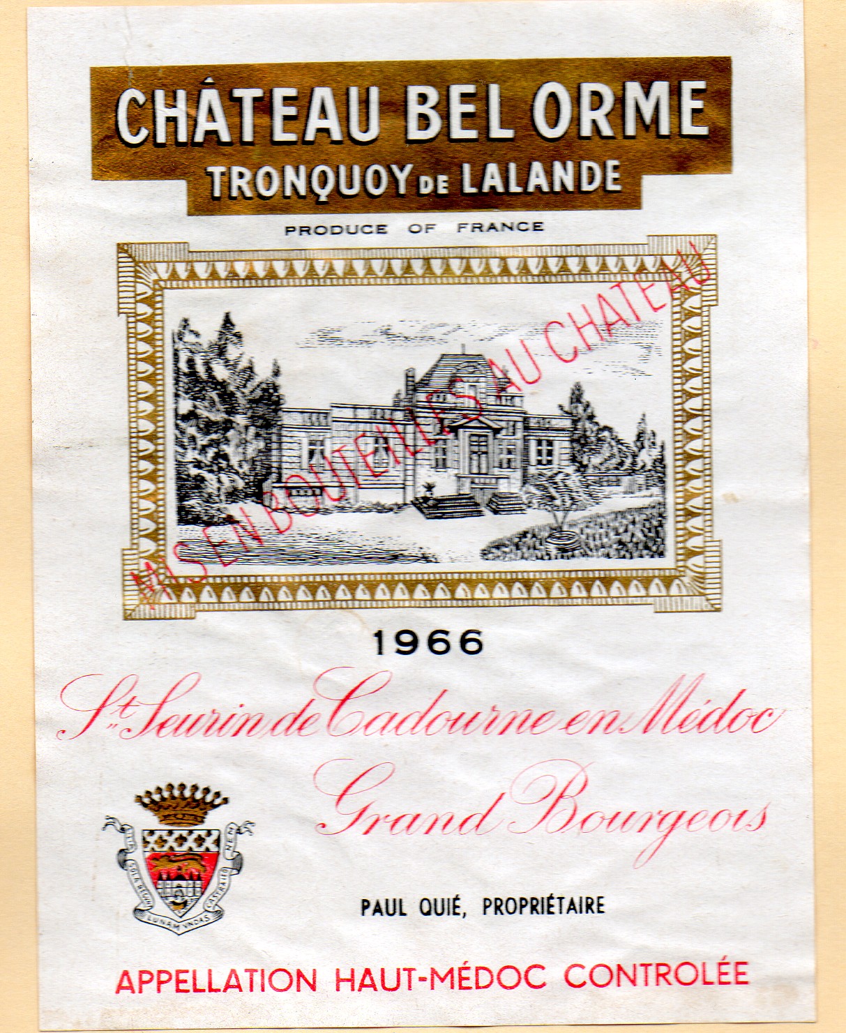 My Uncle had served in the Merchant Marines during World War II and because of that fact, when the Korean War erupted he was one of the first drafted inductees, because the Merchant Marines were not considered as having done one’s time during a war. Let us say that he was one of the oldest soldiers on the front lines that was not an officer. I remember him telling me several times, that there were periods on the front lines when the food rations never arrived, but the cigarette and beer rations always made it. I mention all of this, because my Uncle was one of the first adults that I knew that drank wine, and it was because of his being at all of the exotic ports of call during his stint in the Merchant Marines. To this day, I am not sure if the restaurant even had a liquor license or if my Uncle brought his own in for dinner, I would venture to say that they did, but back then anything was possible, especially when you are in a back corner away from the prying eyes of other patrons. My Uncle was very partial to Bordeaux wines, and I am sure that he would look askance at me if I had referred to it as Claret. The wine label that I am showing is indicative of the wines that he would drink, and of course, I was allowed to have a glass or two in his presence. Oh those were heady times to be treated like an adult at moments. The particular wine that I am showing is Chateau Bel Orme 1966 from the Tronquoy de Lalande district of the Haut-Medoc. It was a Cabernet Sauvignon blend and it is a Cru Bourgeois, meaning that it was not a rated wine from the great classification. We always had red Bordeaux wines with the meals, so I got pretty used to that wine, and what to expect from it. Talk about some early wine memories, and thankfully times were looser and not as strict when I was a lad.