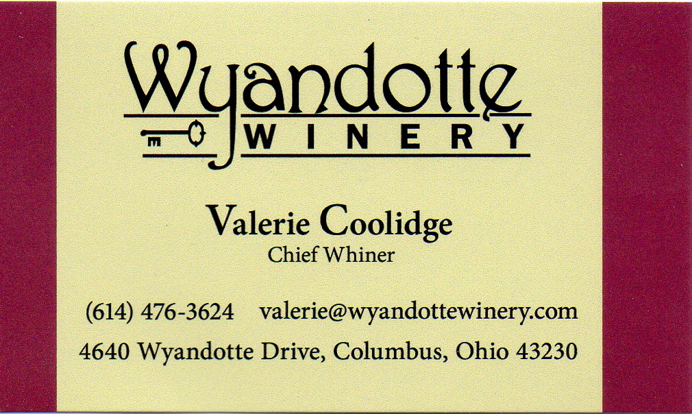 Wyandotte Winery is the first and oldest winery in Central Ohio, and is now in the hands of the third owners. The first two winemakers were more eclectic from what I gather, and the new owners are more varietal oriented in their venture. As we drove around until we finally found the winery, I was almost ready to turn around, as we were in the midst of a residential neighborhood, with no vineyards visible. We went in, and I am sure that I was not the first to ask, if this was a real winery, as even the structure was more of a domicile in appearance. I was assured that it was indeed a winery and the wine making was done in the cellar of the building. The winery buys grapes from Ohio and beyond and makes their wine as they desire. I later found that they have actually begun a small vineyard, and are in the process of buying more land and/or an existing vineyard. The young man that we started with for the tasting, after I related that I have a Blog, as small of a following as I have, decided to have another employee take over the duties of entertaining us, as well as pouring us tastings. We met Valerie Coolidge, the “Chief Whiner” and spouse of the owner and wine maker of Wyandotte Winery, we ended up having a grand old time and probably kept her captive for a couple of hours with discussions of wines. They had an assortment of different labels, all with artwork featuring buildings that had interest to Columbus and Central Ohio as landmarks. They were not trying to gouge the public, as they charged a dollar for every pour of wine, with a maximum of ten pours. Valerie was regaling us with stories about the wine, the labels and life in general; she was a fine raconteur in her own right.