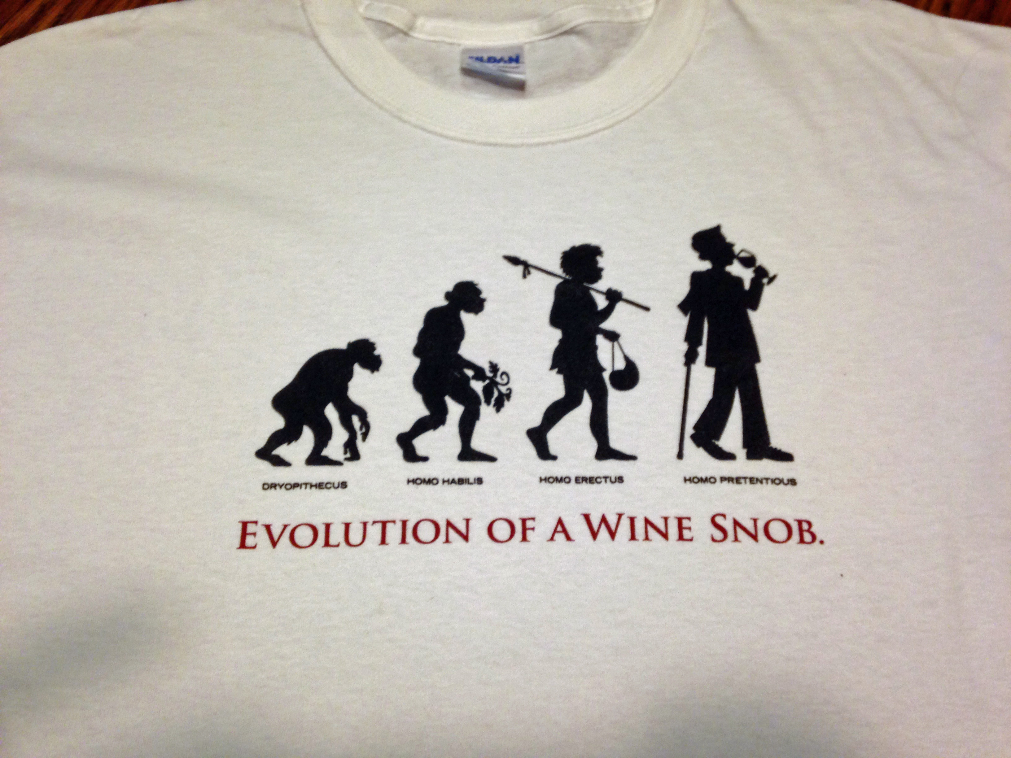 The first was a T-shirt and let me state categorically that I do not have the figure for a T-Shirt; actually I think I look best when I camouflage my body with a shirt and a sport coat. I am sure that I will end up using it as a Cabana Top, since Cabana Suits are a thing of the past, and I am reminded that I am a relic of times past. The T-shirt has four creatures depicted on the chest of the shirt. In case the photo does not do it justice, the first creature is basically an ape with the caption “dryopithecus.” The second creature is a more erect ape with the caption of “homo habilis.” The third creature is of a man as a hunter in the early days with the caption of “homo erectus.” The final creature is of a silhouette of a dandy man with the caption “homo pretentious.” Under the four drawings is the line “Evolution of a Wine Snob” and I am sure that my Bride must have had the proverbial tongue in cheek for this gift to me. I laughed as I wasn’t sure if I should have bristled at the thought that I was a “Wine Snob.”