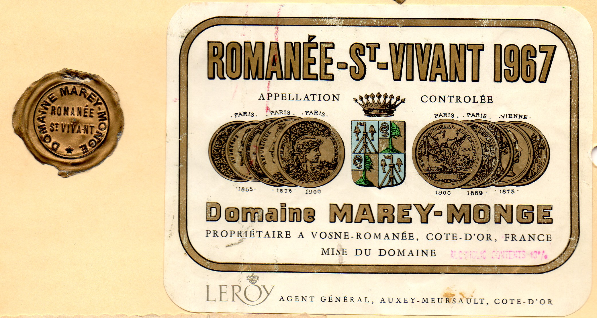 I was being wined and dined in royal style that evening and we had a bottle of Romanee-St.-Vivant Domaine Marey-Monge 1967. This is a Pinot Noir wine from the Cotes d’Or of Burgundy. I have to say that this wine is a bit more than just a Burgundy wine; it is from the Cote de Nuits and the village of Vosne-Romanee. One of the most famous Grands Crus of this village is the four acre estate Romanee-Conti, which is owned entirely by the Domaine de la Romanee-Conti (DRC), which also owns all of La Tache, and parts of Richebourg, Grands-Eschezeaux, Eschezeaux and Montrachet. The only reason that I mention the DRC is that they produce and market the wines of another vineyard in Vosne-Romanee owned by the widow of General Marey-Monge. This was a leasing arrangement and the DRC had first options on the property and they finally purchased the vineyard and this label no longer exists. I think that the salesman wanted to try this wine, and I got to be the lucky recipient of his expense account.