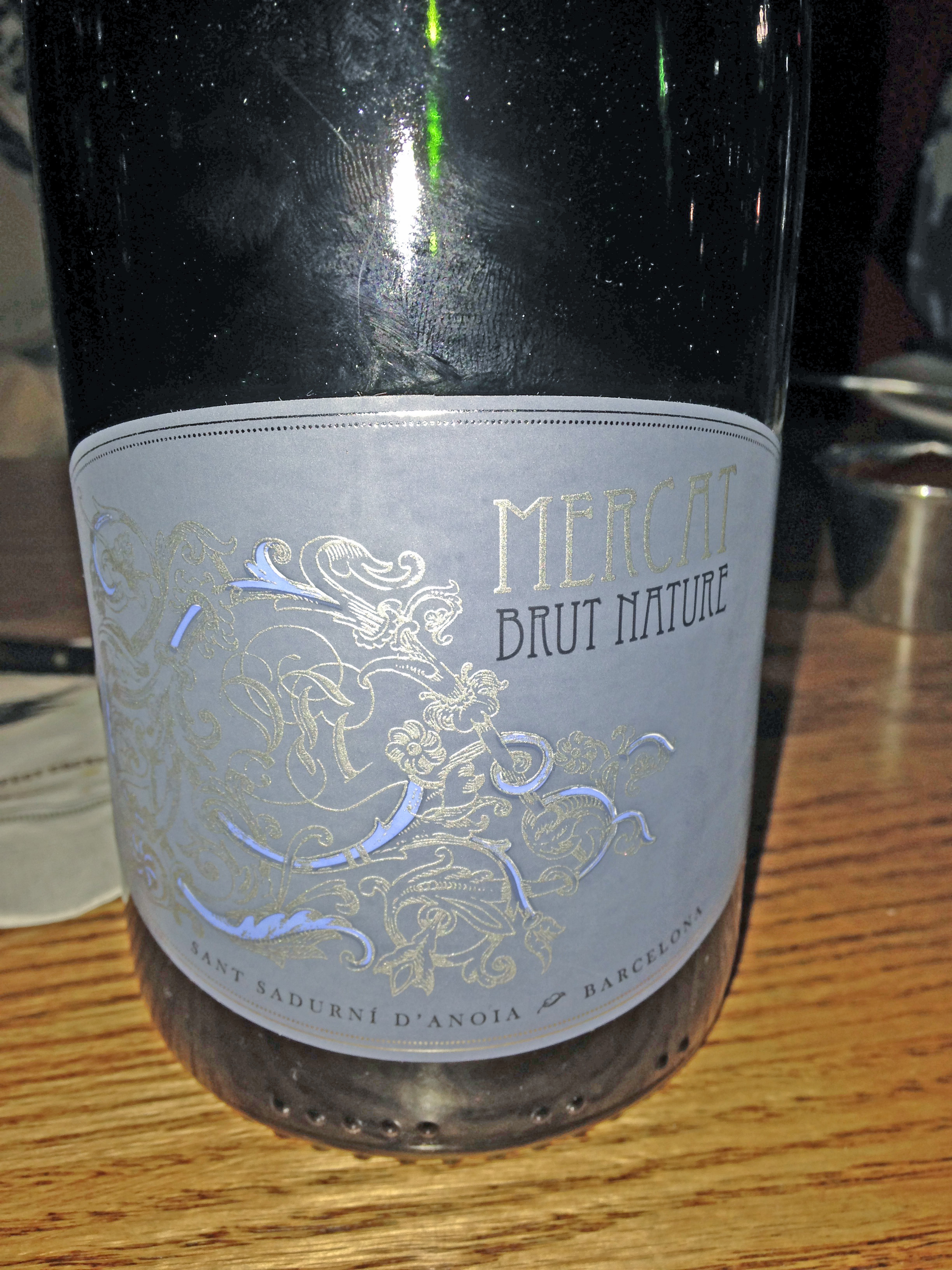 Actually all of the wines that we tried were stilled poured from traditional bottles, so I was able to get a label shot of each wine. We started off with Groundwork Grenache Blanc 2013 from Sans Liege Wines. Grenache Blanc is a work horse among varietals and normally not encountered as a single grape wine, as it is part of the classic Chateauneuf du Pape wines of France and also found in different wines from Spain as well. This wine was sourced from Kopack, Last Frontier and Beato vineyards in the Paso Robles region and there were 900 cases made of this wine. The next wine that I was touted on was Corvidae Lenore Syrah 2012 from the Corvidae Wine Company of Columbia Valley, Washington. This wine was sourced from Yakima Valley and Heaven Hills; as the Columbia Valley AVA is one of the largest in the country. The wine was also the perfect wine for the restaurant as Corvidae refers to a group of black birds, as in the raven, and the name Lenore was also perfect for the venue. Syrah is famous in the Rhone Valley, but it has found a home in the New World as well, as the natural spice of the varietal works with a variety of foods, as far as I am concerned. The last wine that Nina and I both had, and we had it in lieu of dessert was Mercat Cava Brut Nature NV from Mercat Winery of Penedes, Spain. This sparkling wine is made with a secondary fermentation in the bottle, just like they do in the Champagne region of France, only this wine is made from the Macabeu, Xarel-lo and Parellada varietals that are found and used very well in the Catalunya region of Spain.