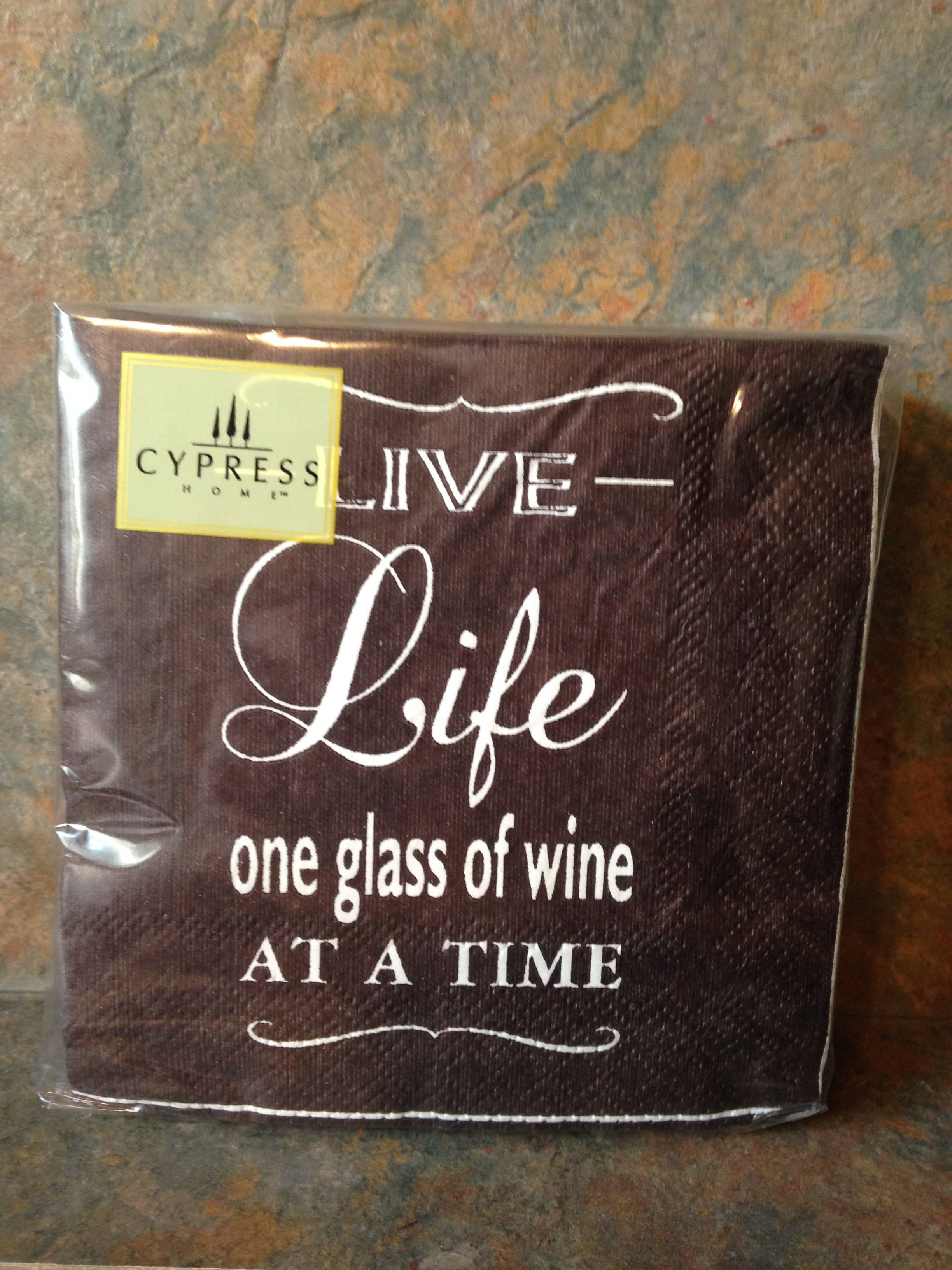 The last item is some cocktail napkins, which can always come in handy, as there are plenty of times to avail ourselves of these. Most of our friends will also appreciate the sentiment on these napkins “Live Life one glass of wine at a time.” In our house all things can be tied in to wine, and why not; in fact I think it is time to have a glass of wine myself.