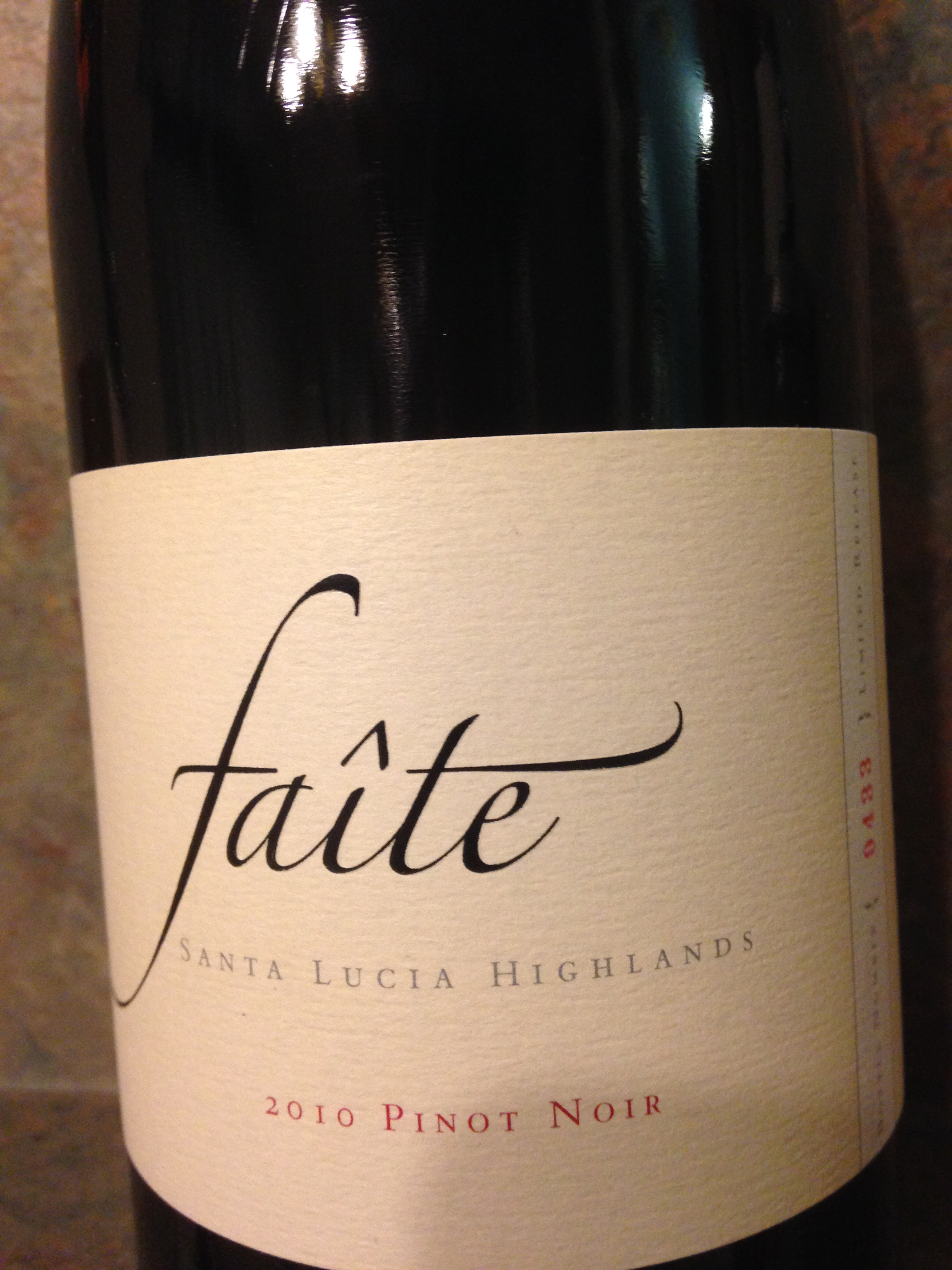 The last wine that I unpacked was a new wine from an old favorite of mine; Paraiso Vineyards Faite Pinot Noir 2010 from the Santa Lucia Highlands. The Smith family of Paraiso Vineyards is one of the pioneering viticulturalists of Santa Lucia Highlands and they have named this wine Faite, which in Burgundy suggests a summit or mountain top, and this wine is the pinnacle of their four decades of growing the finicky Pinot Noir. There was an overload of technical data about the blocks of grapes grown for this wine, which tends to be a bit “Greek” to me. Suffice it to say that each block of a different clone of this grape was fermented in separate tanks and then the wine was blended into six French Oak barrels. There were 148 cases of this wine produced, and each bottle of wine was numbered and the aging potential of this wine is estimated for five to seven years, which I thought was short, but then again, they are probably better at these estimates than I am.