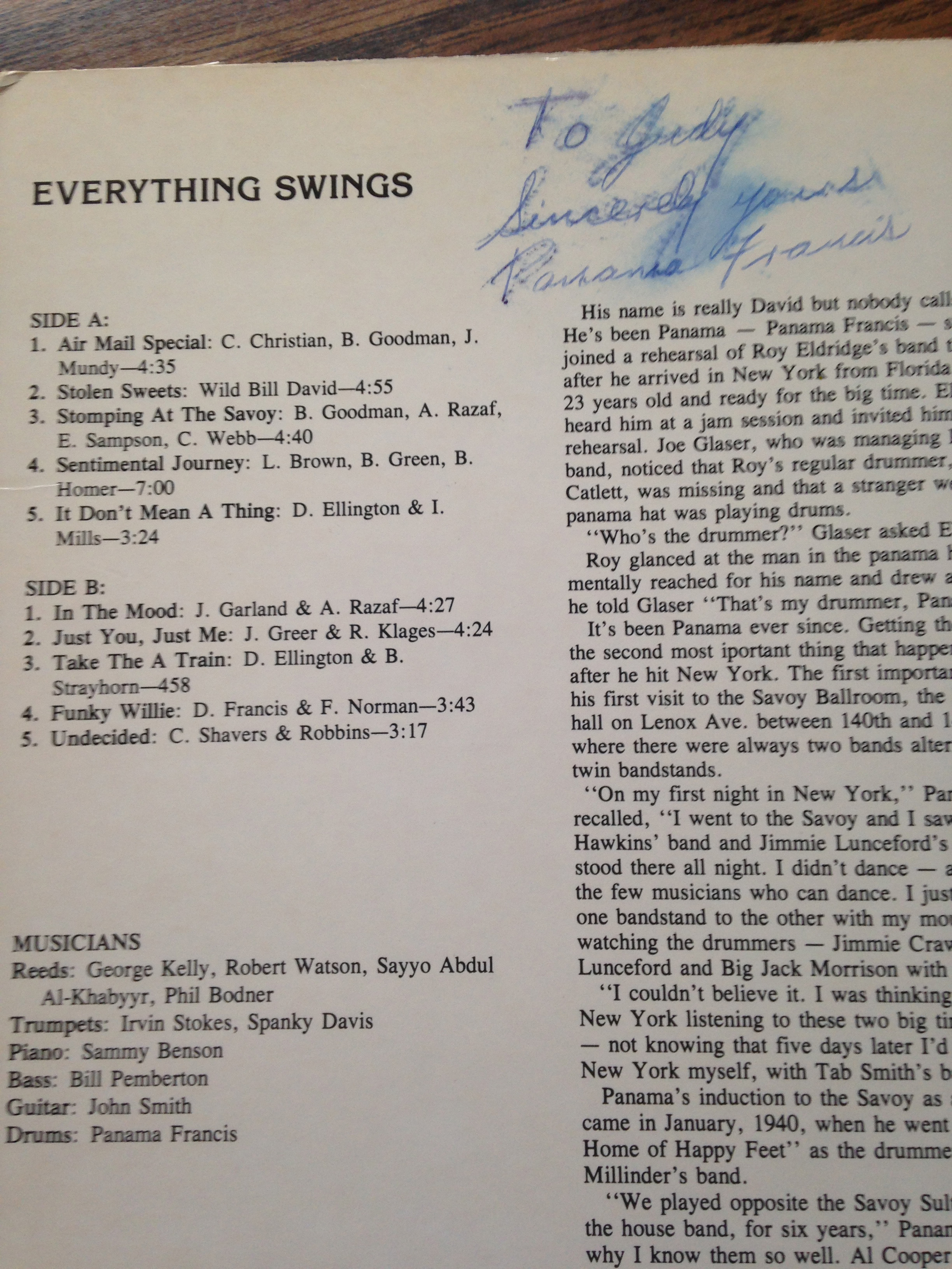 After she finished looking at the menu, she looked at me, and said I also bought the album that the entertainer there was selling. So I went back to where I had put all of the albums and found the album, the album as well as the menu had been autographed by Panama Francis, and the album was Panama Francis & The Savoy Sultans “Everything Swings.” Panama Francis at one time toured with Cab Calloway and in 1979 reestablished his group the Savoy Sultans and were the resident entertainers at The Rainbow Room for six or seven years. As I looked at the album I realized that while my Bride always enjoyed the same dishes and wines over the years, she also enjoyed some of the same music that she still does today as in : “Stomping at the Savoy,” “Sentimental Journey,” “In the Mood,” “Take the A Train” and of course “It Don’t Mean a Thing.”