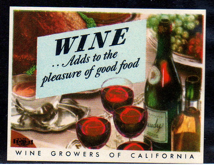 I was looking for some visual aids to use for this article, and I went searching in one of my many other hobbies and found a couple of advertising poster seals, that were much more popular from the 1920’s to the 1940’s, and I would venture to say that the two items that I found were probably from the 1940’s. The two items were put out by the Wine Growers of California and they both show wine as an integral part of a dinner. I did a search of the Wine Growers of California and I could not find them, though I would not be surprised if they have changed the name of the association perhaps several times over, which is not uncommon for many organizations as the course of their focus may change. I heartily endorse their appeal back then, and I still approve of the concept of National Wine Day as well.