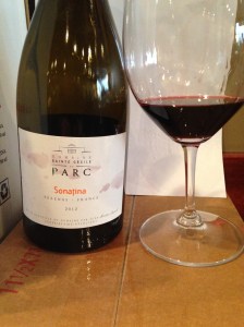 The penultimate wine for the evening was Domaine Sainte Cecile du Parc Sonatina 2012 which had the AOC Coteaux du Languedoc Pezenas. A Sonatina is a short sonata, which definitely carried on the theme of the winery. This wine was a blend of seventy-five percent Syrah and the balance was Cinsault, and the vines on the estate for these grapes were about thirty-six years old. This wine was aged for twelve months in French Oak and it was very mellow with nice heavy legs. I think that the Cinsault evened out the Syrah and I think that this would be a great dinner wine, and talking with some others, this is where they were going to invest heavily into their purchase.