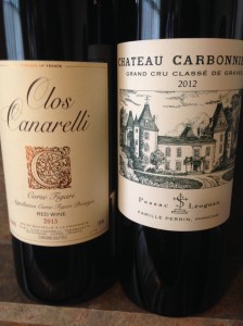 The first wine that I will discuss is from Corsica and while this island may have an Italian heritage woven into the tapestry of its existence, it is a department of France and abides by the wine rules of France, which in some cases have been reworded to be more closely tied to the Common Market. Clos Canarelli Corse Figari 2013 is such a wine. The Appellation Corse Figari Protegée identifies the wine from Corsica and the village of Figari is in the southern tip of Corsica. The wine is eighty percent Niellucciu and the balance is equally split among Syrah and Sciaccarellu and while those are the local names for the grapes, we know Niellucciu as Sangiovese and Sciaccarellu as Mammolo, and the blending of those two grapes are one of the main types of wines on the island, and it also shows how the Italian heritage is always present. The Clos Canarelli was bought for a gift and so was the next wine that I will discuss. Chateau Carbonnieux 2012 is a Grand Cru Classe of Graves in the Bordeaux region. Chateau Carbonnieux is a Grand Cru Classe awardee for both their white and red wines, which is a bit more common occurrence in Graves. The winery is in the Pessac-Leognan area of Graves and this red wine is a classic blend of Cabernet Sauvignon, Cabernet Franc, Merlot and Petit Verdot. This wine starts of in fermentation in Stainless Steel and then ages in oak for eighteen months. Graves has a unique taste for Bordeaux as the area is named for the terroir; Graves means gravel and not a hole in a cemetery.
