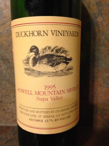 I went down to the cellar and grabbed a split for the two of us to enjoy and I thought I would look for something different and interesting. There is always a chance that a split may not have as long of a shelf life as a full bottle or a magnum, I thought it was time to check it out. We shared a bottle of Duckhorn Vineyards Howell Mountain Merlot 1995. Duckhorn Vineyards was one of the pioneers of Merlot in Napa Valley when everyone else was interested in Cabernet Sauvignon. Howell Mountain is one of the most prestigious sub-region AVA’s in Napa Valley, and they were awarded the designation in 1984, Napa Valley was awarded their designation in 1981. There is no actual Howell Mountain, but it is a long and narrow hillside (mountain side) and named after the Howell Mountain Township, which is up above Calistoga. Since we had bought the wine at the winery and I am such a pack rat, which has helped over the years writing about wine, I actually found the winery tech sheet. The wine is 76% Merlot, 14% Cabernet Sauvignon and 10% Cabernet Franc; and 96% of the fruit was harvested from Howell Mountain and the rest was from Napa Valley. The wine spent twenty months in French Oak of which half was new. I was a little concerned because the cork crumbled as I tried to open the bottle, and I had to decant the wine using a funnel and a coffee filter, and it was a good thing that I did decant it, as there was a lot of sediment that had settled on the side of the bottle during all of that cellar time. The nose was delightful and filled the room during the decanting period. The color had softened and was not as deep as a young Merlot would have been, as it had a little brown in the mix. The taste was sublime, the tannins had all mellowed out and it kind of reminded me of an aged Chateau Cheval-Blanc, it was that smooth; and it was too bad that we only had to oversized glasses of the wine to enjoy.