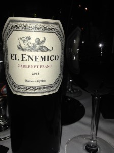 Our Daughter-in-Law very seldom drinks anything stronger than a cola, and our Son prefers beer, and when he asked what beers were on draught, he was informed that they only have bottled beer, so he asked what Michigan craft beers do they carry and the waitress immediately mentioned Corona, which struck both of us as odd, I guess when no one was looking Mexico was annexed to Michigan. They finally brought him a beer list and he was happy. As for my Bride and I we went with a bottle of wine, which is what I tend to write about. I was going to go with an Italian wine, but one wine caught my attention from the list and it intrigued me, and it really intrigued my Bride when I pointed it out to her. We had a bottle of El Enemigo Cabernet Franc 2011 from Mendoza, Argentina, so we had to try something new. El Enemigo means the enemy, and the vintners Adrianna Catena and Alejandro Vigil applied this quote on the back label “At the end of the journey we remember only one battle: the one we fought against ourselves, the original enemy. The one that defined us.” The wine was basically all Cabernet Franc with only eight percent Malbec blended in. The fruit came from the Gualtallary district of Mendoza and was aged for sixteen months in French Oak, of which twenty percent was new. The wine had a beautiful color, with a terroir driven nose. It started off a bit tight, but it opened up during the course of the meal and it turned out to be an excellent and refreshing wine choice. The company, the conversation and the wine all made up for my meal, and I know that we will end up going there again in the future.