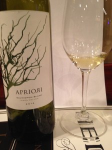 The first wine of the evening was an Apriori Sauvignon Blanc 2014 from Napa Valley. I have had another wine from this winery that I enjoyed, so I looked forward to it, and the name of the winery actually means “from the beginning” or a fancy way of saying deductive reasoning. The fruit came from the Farella, Morgan Lee and Yount Mill vineyards. The fruit was hand harvested and fermented in Stainless Steel for thirty days, and then it was aged for eleven months in neutral French Oak. The winery produced five-hundred-forty cases of this wine. The wine had a very soft straw color in the glass and I thought a much better nose than I usually encounter from a Sauvignon Blanc with a decent finish to it. One of the people at the table that I was seated at, attested to tasting white grape juice, but I thought that it had the classic flavor of grapefruit, which I look for, from this varietal and others as well as our host agreed.