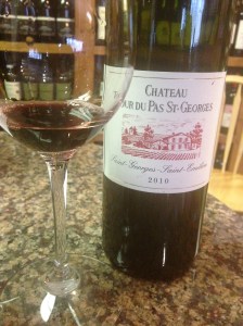 The first wine is Chateau Tour du Pas Saint-Georges-Saint-Emilion 2010.  Here is a wine that is sixty percent Merlot, thirty-five percent Cabernet Franc and five percent Cabernet Sauvignon.  This wine was aged for fifteen months in French Oak, of which thirty percent was new.  I found this wine to have a nice color, with a lot of spice and a fine finish.  I have always had a certain fondness for wines from Saint-Emilion, and this wine carries the Saint-Georges addition, which is the smallest sub-district of the area and according to the rules, it could either use Saint-Georges-Saint-Emilion or Montagne-Saint-Emilion, which I just find curious.