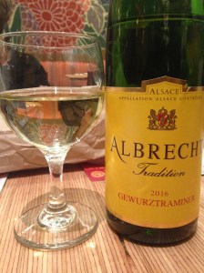 Since I knew that we were going there to eat, I stopped by a day or two preceding our dinner to look at the wine carte, and I was surprised that they did not have a single Gewurztraminer listed, and I think of this as a basic go-to wine for this type of cuisine, and in actuality, the wines that they were offering were just basic red and white wines that the average diner would recognize to go with any popular priced national chain. I asked if there was a corkage fee, if I elected to bring in a wine of my own choosing and they said that there would be a ten-dollar fee, which I could live with. Off I went in pursuit of a wine and I did not want to go crazy, but I wanted something interesting. I found a bottle of Lucien Albrecht Tradition Gewurztraminer 2016 from the Alsace in France. This winery goes back to 1698 and has survived the turmoil that is Alsace, swinging from one kingdom to another and back again. They also pride themselves on hand harvesting the fruit and becoming increasingly better stewards of the land, as the industry has been going. I could not find any technical information about this particular wine, but I will venture to say that it was probably aged in Stainless Steel. It had a very nice soft color, with a soft nose, and it may have been one of the most delicate Gewurztraminer wines that I have ever encountered. While the others were enjoying the food, I enjoyed the wine.