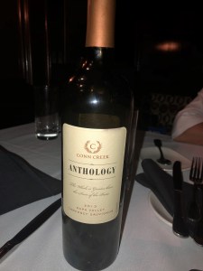 The second wine that she sent for me to admire, and you may notice that she did not send us the wine, was when she was having dinner at the Capital Grille in Washington D.C., one of her favorite restaurants, and when she is up here, she makes it a point to at least have lunch there. The wine she was raving about was Conn Creek Anthology Cabernet Sauvignon Napa Valley 2013. She should rave about this wine, as it is the flagship of the winery. In 1973, Bill and Kathy Collins started to make Bordeaux style wines in Napa Valley. In 1979, they built Conn Creek Winery in Rutherford, and they were one of the first “green” wineries back then, they were pioneers both in the wine and the conservation. You will notice that the wine has a name “Anthology” and it also says Cabernet Sauvignon, and while it is eighty-eight percent Cabernet Sauvignon, the balance shows their Bordeaux beliefs as it is Cabernet Franc, Malbec and just a wee amount of Petite Verdot. This wine was aged in fifty percent new French Oak, five percent new American Oak and the balance in neutral barrels. I can readily understand how she could get enthusiastic about this wine, and yes, Ms. Yoga we miss you and look for your next time here.