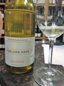 The Forlorn Hope Que Saudade Verdelho 2015 was an interesting wine. Verdelho was one of the grapes used in Portugal for years in Madeira wines, but now one sees it quite a bit from Australia and in California. As the label reads “Another Rare Creature Vinted and Bottled by Winemaker Matthew Rorick.” This wine comes from Amador County and the fruit comes from Forlorn Hope’s Rorick Vineyard, as well as from DeWitt and Vista Lune Vineyards. The fruit was hand harvested and whole cluster pressed with a total production time of fourteen months in Stainless Steel and Neutral Oak. The wine was bottled unfined and unfiltered. There were three-hundred-sixty-seven cases of this wine produced. I found it to have a very subtle nose, which is how I find most Verdelho wines, with a soft straw color and a short finish. I think this wine would be excellent with friends on a summer day while you are having a chat waiting for dinner.