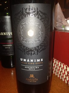 After we were situated, we went to join our hosts in the main house.  Lo and behold they had just the proper remedy for our road trip.  We had a couple of bottles of wine.  The first wine was Carnivor Cabernet Sauvignon 2015.  While most of the fruit came from Lodi, it was blended with other fruits, so it carries a California designation.  The wine has been blended with some Petite Sirah, but not enough to lose the Cabernet Sauvignon label.  Carnivor is under the E&J Gallo umbrella of wines and this wine has been produced in ample quantities to be found almost everywhere.  For the price, it is a good dependable wine and goes well with food.  It is a wine that one could find in a lot of restaurants.  The second wine that we opened up was a bit more interesting, think of it as an Argentine Claret.  The Mascota Vineyards Unanime Gran Vino Tinto 2013 had more to offer.   This wine is from Maipo, which is a subset of the Mendoza in Argentina.  The wine was sixty percent Cabernet Sauvignon, twenty-five percent Malbec and the balance were Cabernet Franc.  It was the perfect way to end the day.