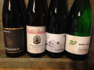 I have to admit that I went back and did some studies about the wines of Germany, as I do not encounter them that often. In the old days when I first started learning and teaching myself about wines; France, Germany and Italy were the three main players that one would encounter in wine shops and in restaurants. In the 1960’s and the 70’s the three largest selling German wines were Liebfraumilch, Blue Nun and Zeller Schwarzer Katz. The first two were from the Rhine regions and the latter was from the Moselle-Saar-Ruwer. As I was unpacking the wines I was trying to find a common denominator as the wines were from different wineries, and the only commonality was that the four wines were from the Rhine region, three from the Rheinpfalz and one from the Rheinhessen. The varietals were all different as well. Three of the wines were Qualitatswein, which is the second tier of German wine classification and then the wines must come from thirteen official wine regions; this classification probably accounts for the bulk of wines that one finds routinely. The fourth wine is a Qualitatswein mit Pradikat, or fine quality.