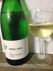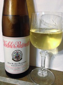 The first wine of the evening was from Weingut Borell Diehl Muller-Thurgau Trocken 2017. This wine is a Qualitatswein from the Rheinpfalz. Qualitatswein is the Second Tier of German Wine Classification and about seventy-five percent German wine falls under this designation and the wine must come from thirteen official Andaugebiete (wine regions). The grape for this wine is Muller-Thurgau which is a cross between Riesling and Madeleine Royale, created in 1882 by Dr. Herman Muller of Thurgau, Switzerland. Known for a peach aroma and low acidity, it has suffered the ups and downs of popularity, because there is more current interest in planting Riesling. I found the wine to have a pretty soft straw color leaning towards a bit of gold. As the wine began opening up, I found it to have some hints of peach and green apple, which was refreshing, especially as it was the first wine. I also found it to be chewy, which may not be a current acceptable wine term, but one that was bandied around when I was being introduced to wines, and I found that the wine had more acidity than I had expected and it had a nice long finish. My Bride described it as delicate and light and thought she would we enjoy it with Whitefish, the very popular dish here in Michigan. She also remarked that the bottle looked bigger, which I didn’t think much of it, but it was pointed out that the bottle did actually contain one liter of wine, so it was a bonus serving. She kept going back to it.