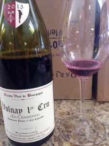 With almost no fan-fare I was handed a glass of Domaine Monthelie-Douhairet-Porcheret Volnay 1er Cru En Champans 2015. Volnay is one of the heralded regions within the Cote de Beaune and there are thirty-five Premier Cru Vineyards that have stood the test of time in Volnay. Champans is located in the heart of Volnay and if one looks at the map of the region with all the vineyards penciled in, one wonders how anyone can keep it all in order and make sense of it. I think because of this quirk, the entire area of Burgundy is sometimes avoided by some wine lovers, who feel that they can find Pinot Noir wines in more easily understood areas. My experience is in retail (not wine) and I can appreciate and take the time to try to decipher the chaos of Burgundy; by the way the wines of Volnay have always been described as delicate with vibrant tannins and that is so true, and until one actually tries a true Burgundian wine, the idea that all Pinot Noir wines are the same is quickly shattered.