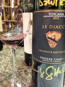 I actually started off by tasting the Podere Ciona Chianti Classico Riserva DOCG 2008, only eleven years after their first commercial bottling. Like all Chianti Classico Riserva wines, this wine is made with ninety-two percent Sangiovese grapes and the balance is made up from Merlot and Alicante Bouschet. The wine is aged for eighteen months in French Oak in two distinct types of barrels and then some time in the bottle before release. Since the winery figures that they achieve one bottle per vine, they produced six-hundred-seventy-five cases of this wine. The nose and color were big, just as I expect from this wine with red fruit, but what really pleased me is that the winery is in the town of Gaiole and I was amazed at the terroir that was in my glass and some heat, the heat I expected, but the terroir was a definite bonus. The wine that I tasted right afterwards was Podere Ciona La Diacce Rosso Toscana IGT 2013 and this is their flagship wine. This wine is a Merlot wine with just a touch of Alicante Bouschet added to give it a little Italian zest. This wine gets basically the same treatment that the Riserva does in regard to details like eighteen months in two different size French Oak barrels and then additional time in the bottle. I think that I would have preferred having tasted this wine first, because it was younger and the fruit was much more evident. I have always been partial to Merlot and I guess that I have a natural bias towards it, but this wine I really think would benefit with about ten years in the cellar and then it will display why it is their flagship wine.