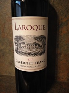 The second wine was Domaine Laroque Cabernet Franc, IGP Cite de Carcassonne 2017. The IGP classification replaced the old Vin de Pays to make France align to the other members of the Common Market. The IGP Cite de Carcassonne is a large area in the Languedoc region and encompasses eighteen communes and allows all three colors of wines. The average age of the vines for this wine is twenty-five years, and this area has been producing wines from the Sixth Century. The soil in this area is clay and limestone and hillside vineyards. The wine is a very pretty red and very easy to drink, as I just had this wine with a dinner that I wrote about and we enjoyed especially for the price, and it really opened up after the second glass. My Bride was very happy when I showed her this wine.