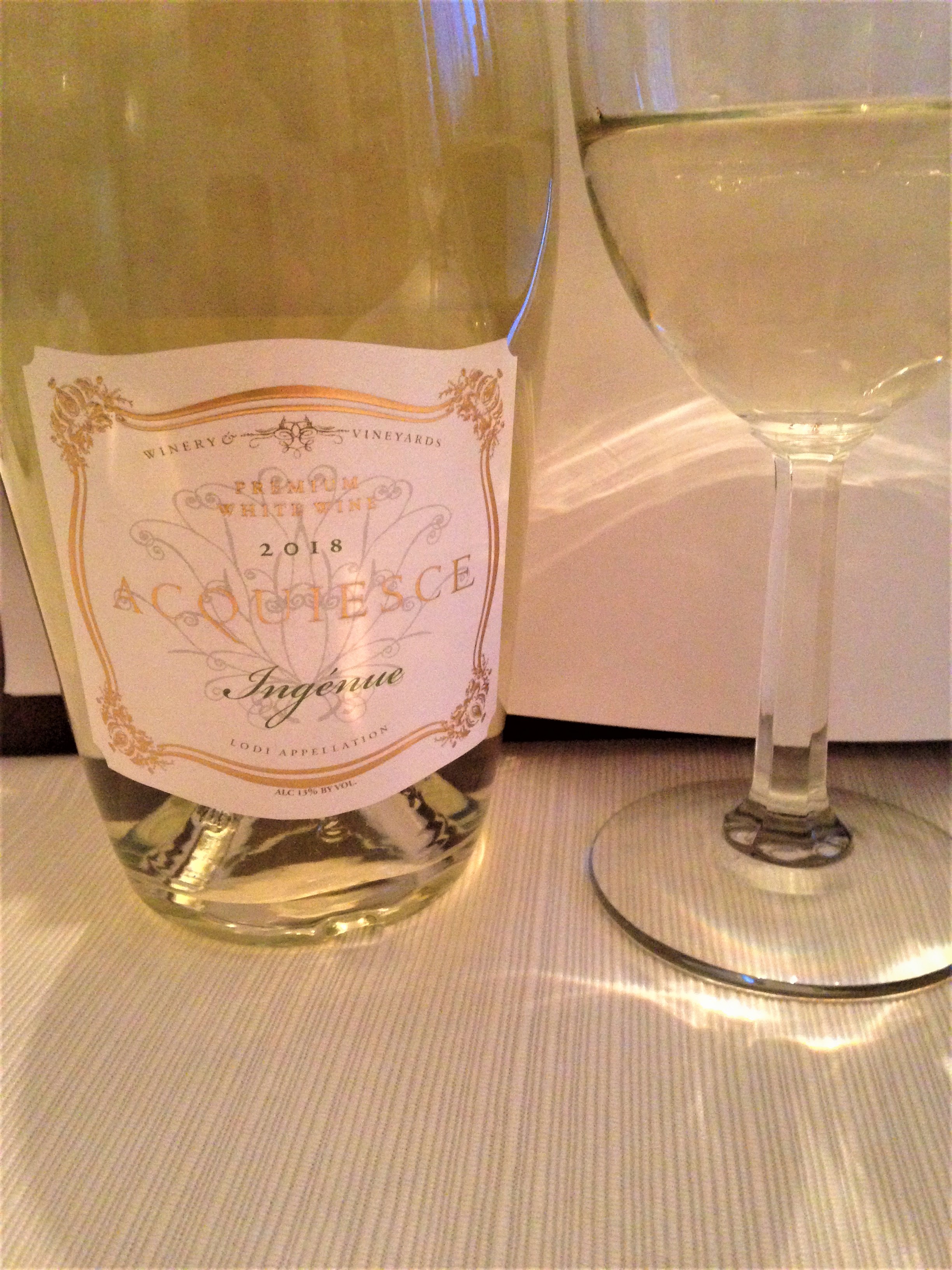 The first wine of the evening was Acquiesce Winery Ingenue Lodi 2018, and this wine will official debut in July of this year, so it was an honor for all of the tasters to be included. Sue and Rodney Tipton have a very unique reputation in Lodi and in the wine community as a whole. They only grow and bottle white wines, plus one bone dry Rosé and they use no barrels, only Stainless Steel; all of the aging of the wine occurs in the bottle. The estate is ten and a half acres and all of the wine is estate grown. The winery opens in March and usually closes in November, because all of the wine is sold out by then. This wine is so new, it hasn’t been posted on their website, but through the magic of the Internet, I was able to find out about Acquiesce Ingenue. Thirty-five percent of this wine is Grenache Blanc, which is also known as Vermentino or Rolle, depending if you are in the Languedoc or Provence, and this grape is known for its floral and lemon citrus notes. Thirty-five percent of this blend is Clairette Blanch which is seen mostly in the Rhone and the Languedoc, and is known as the “light one” because it has low acidity and can oxidize quickly and it evokes citrus and stone fruit notes. Twenty percent of this wine is Bourboulenc and is usually found blending with other grapes in the Languedoc, Provence and the Rhone and it is known for its citrus tones and for smoke and spice flavors as well. Ten percent of the blend was Picpoul Blanc, which literally means “stings the lips,” because of its acidity and is famed in the Languedoc-Roussilon for its herbal and citrus notes. These four varietals blended expertly together created a beautifully nuanced, complex layers of citrus, spice and a mouth-watering acidity that was extremely refreshing. My Bride who did not have access to my notes had opined that this must be a Viognier blend, as she loves the floral tones of that grape, and she was a bit disappointed that it was not one of the grapes, but she was enthusiastic about the wine, throughout the evening.