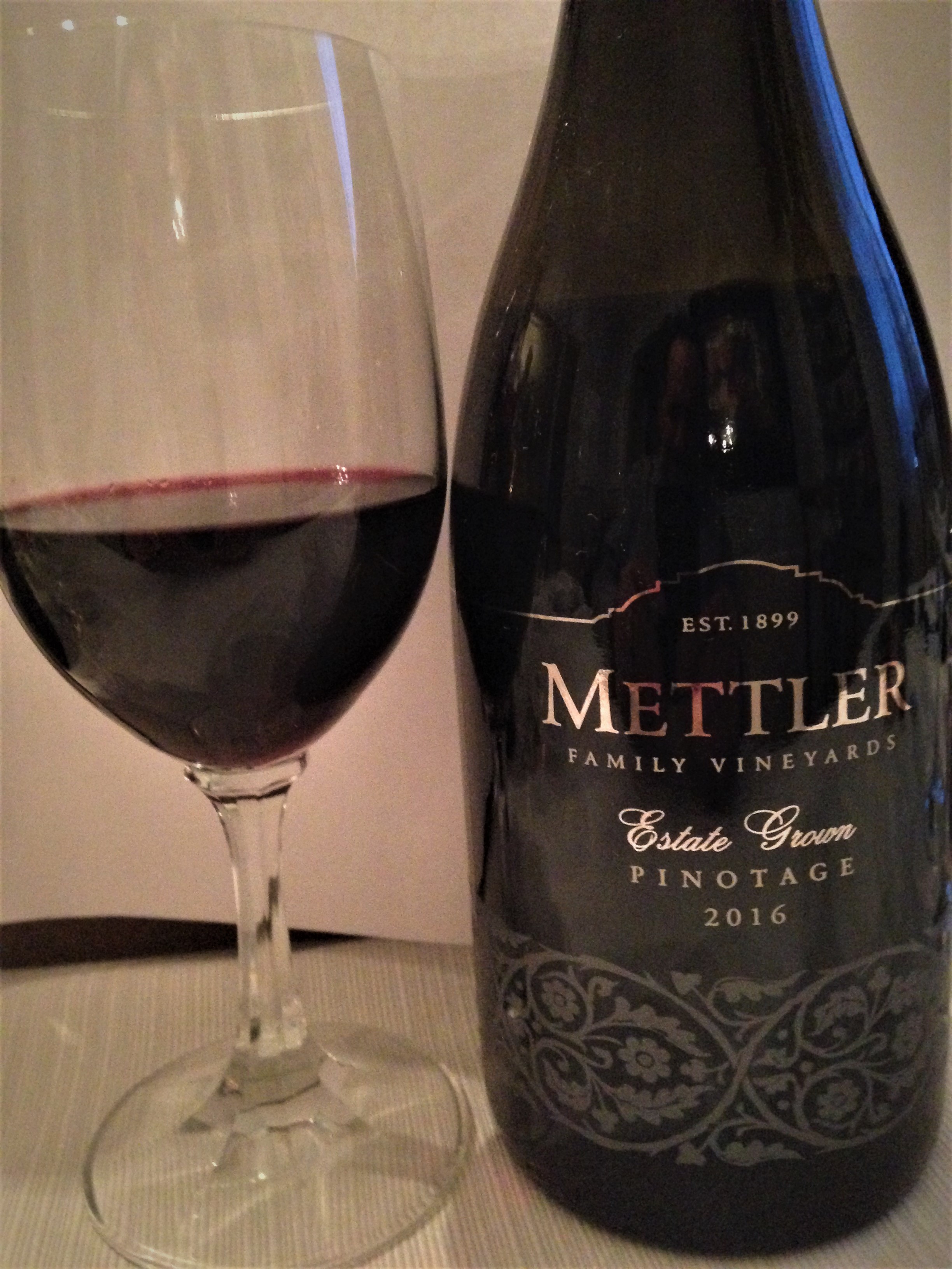 The fourth wine of the evening was the first red as well.  The Mettler Family Vineyards Estate Grown Pinotage Lodi 2016 was an interesting choice.  The Mettler family is one of the oldest families in Lodi since the late 1800’s and wine growers for six generations.  They have attained the Lodi Rules Sustainable Winegrowing Certified Green status and then in 2010 went to the next level CCOF (California Certified Organic Farmers).  Pinotage is South Africa’s signature grape, a crossing of Pinot Noir and Cinsaut that was developed in 1925, but the first commercial planting was done in 1943.  Pinotage is a portmanteau from the two grapes, Pinot Noir and Cinsaut which is known locally as Hermitage.  I am not an authority on Pinotage by no means, but this was the first time that I did not notice a strong influence of terroir, and I may be naïve, but I thought this variety tended to evoke the land.  The nose promised dark fruit and a wispiness of smoke, the taste delivered some black cherry with mild acidity and moderate tannins.  My Bride is still reticent about Pinotage, but she is slowly appreciating the wines we have had.