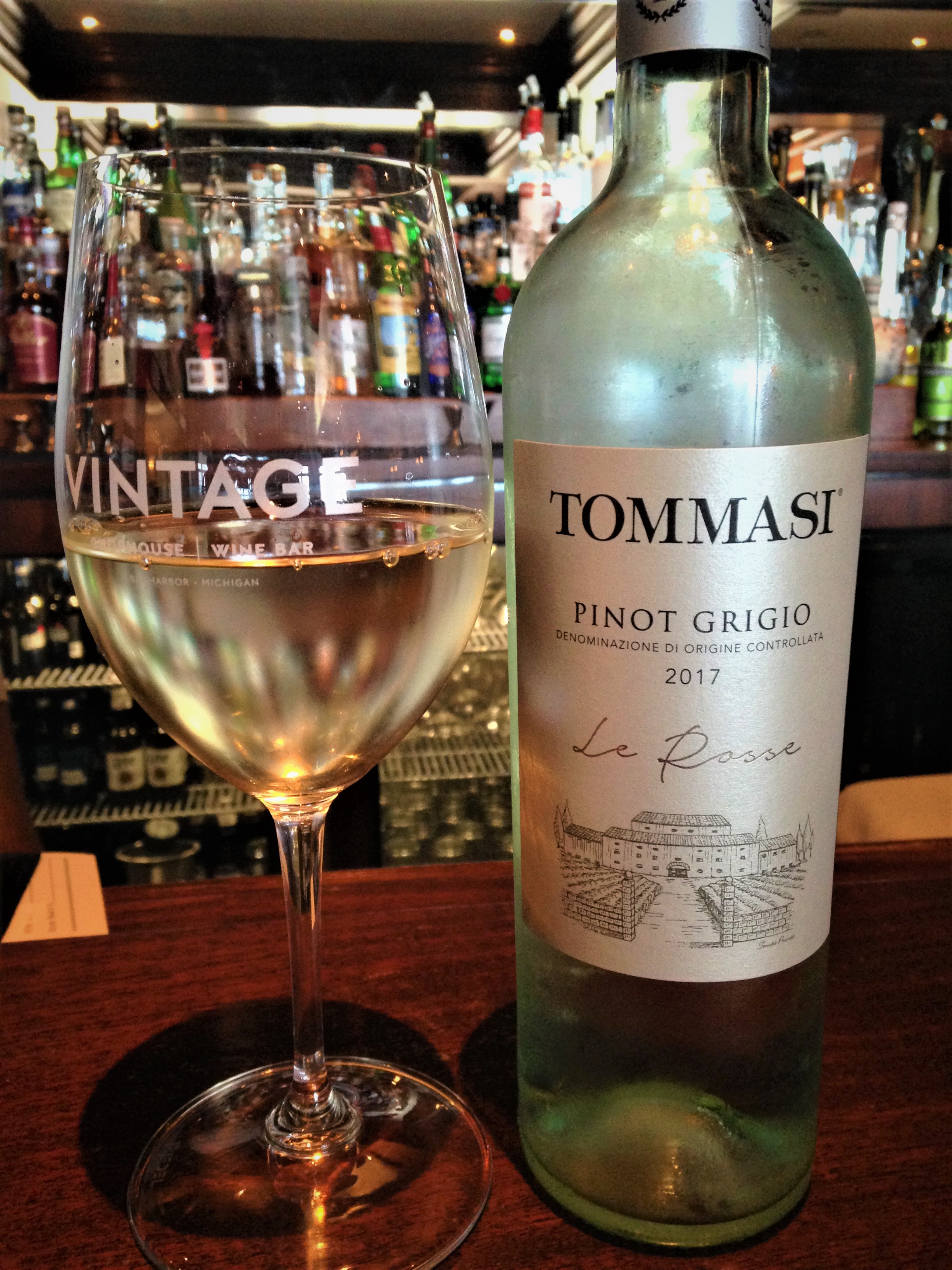 When we finally found the Inn at Bay Harbor, which is not an “Inn” as my mind’s eye had preconceived and it was only a couple of blocks from the “downtown” shopping area and the actual marina.  I was a little miffed, when we pulled up and found that our room wasn’t ready, so my Bride grabbed her laptop and found an area to keep working.  I on the other hand started to survey the area, and decided I needed something chilled to chill my mindset.  I discovered the Vintage Room, which was a bar, wine bar and a private restaurant and they were not averse to pouring me a glass of wine, so things were looking up.  I wasn’t looking for anything special, something chilled and I selected a glass of Tommasi Viticoltori Le Rosse Pinot Grigio DOC 2017 and it was a very generous pour in a Riedel wine glass and things were looking up.  Tommasi Viticoltori was founded in 1902 in the Veneto region and they are famous for their Amarone and many other wines as they have slowly increased their holdings in Lombardy, Tuscany and Puglia and now are in their fourth generation of family running the winery.  The wine is pure Pinot Grigio and Le Rosse is a single vineyard in the Valpolicella Classico district and I would venture that the wine was aged for a short time in Stainless Steel, because it was very fresh (green), and offered a distinctive “flint” terroir.  I had just gone out in the lobby that my Bride was working so she could have something cold and refreshing, then I stepped out the back door to look at the bay and saw Harbor Springs on the far side.  As I came back into the hotel, one of the workers at the front desk came by an handed me the keys to the room, which I thought was a great touch, so that we wouldn’t have to stand in a line again.  Things were definitely looking up, as the Bell Captain unloaded the car and took everything up to our room.