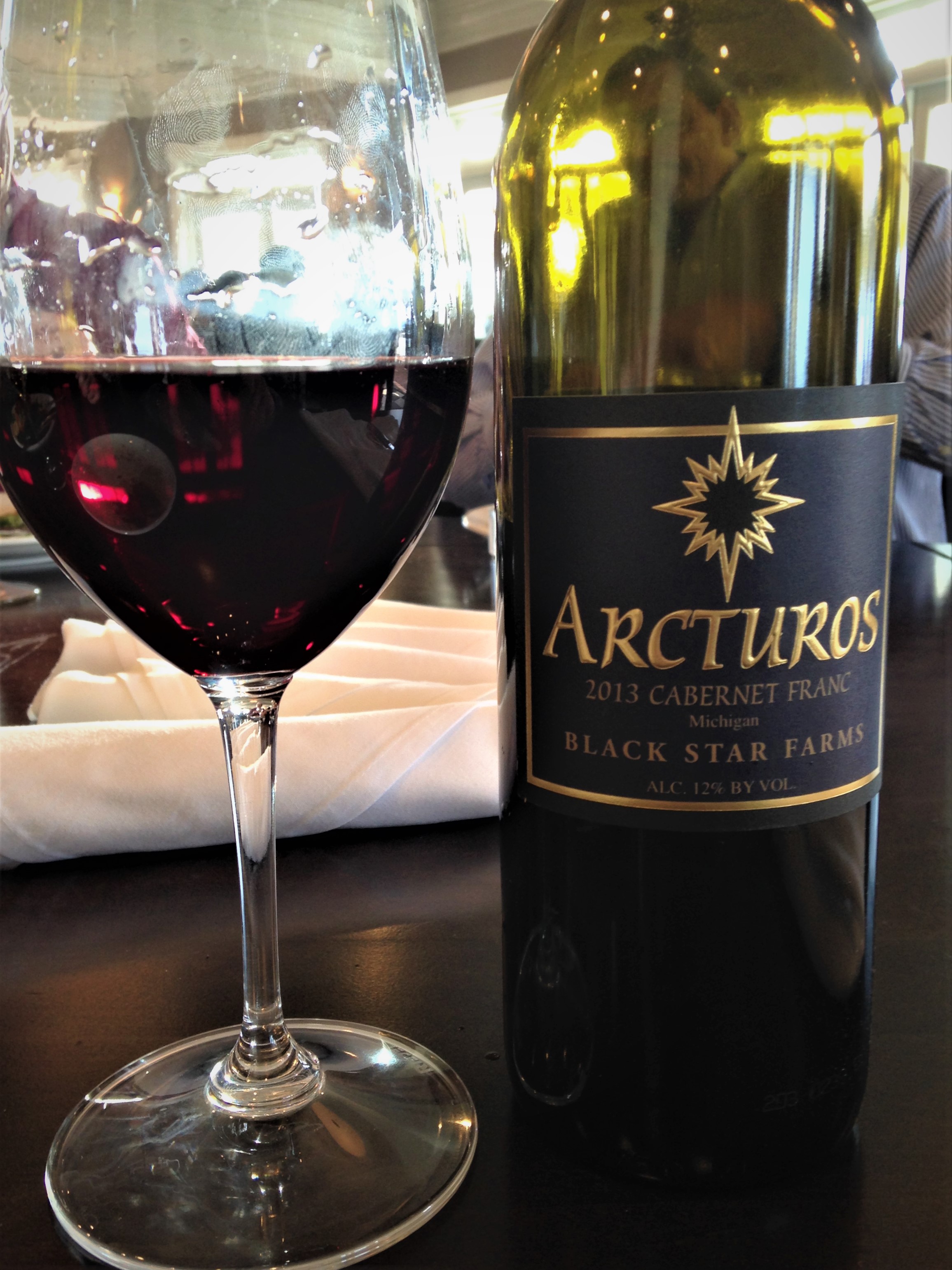 I was anticipating enjoying the same wines that were offered the night before, but I had to get my iPhone out again, because the theme of the beverages was Michigan that evening. They were featuring some of the new Michigan distilled products, some of our huge craft beer industry offerings and of course the always improving Michigan wines, that I like to write about when I have the moment. The three wines that I had the chance to drink with dinner were all from Black Star Farms on Old Mission Peninsula, just north of Traverse City, which we visited a couple of times and enjoyed their wines many more times. All of the wines were also from their Arcturos Collection. In 1998 Black Star Farms purchased Sport Valley Farm which was a one-hundred-twenty-acre equestrian facility, and the stylized black star was part of the architectural décor in the main house. They now have property and production sites on both Old Mission Peninsula and Leelanau Peninsula. The first wine that we had that evening was the Black Star Farms Arcturos Sur Lie Chardonnay 2016. This wine was aged in Stainless Steel, and it offered up some great citrus fruit aromas and tastes with a real crisp finish. I mean this wine was just perfect and I think both my Bride and I decided to add a trip to Black Star Farms, just to buy this wine, as we had originally planned on just going to new wineries that we hadn’t visited before. The next wine that I got for the two of us was the Arcturos Cabernet Franc 2013 with a Michigan AVA, because the fruit came from both peninsulas, which have their own AVA. This wine was aged for ten months in neutral American and Easter European barrels. This wine was delicious and delivered some red and dark fruit flavors and some pepper, and we decided for sure that we had to stop and get some of this wine as well. It was perfect and the finish would make me smile and it was delicious with the Wagyu beef. The final wine that we tasted with our meals was the Arcturos Pinot Noir 2016 also with a Michigan AVA, because the fruit was harvested from both peninsulas. This wine was aged for ten months in French Oak for ten months, of which forty percent was new. This was really a delightful Michigan Pinot Noir, perhaps the best that I have had, as it delivered some plum, but mostly dark cherries to me with a nice finish. All I could think of, was did we have enough trunk room? While I enjoyed some more wine, my Bride went off to find her usual collection of cronies to play some Euchre, it definitely was a Michigan evening. was a Michigan evening.