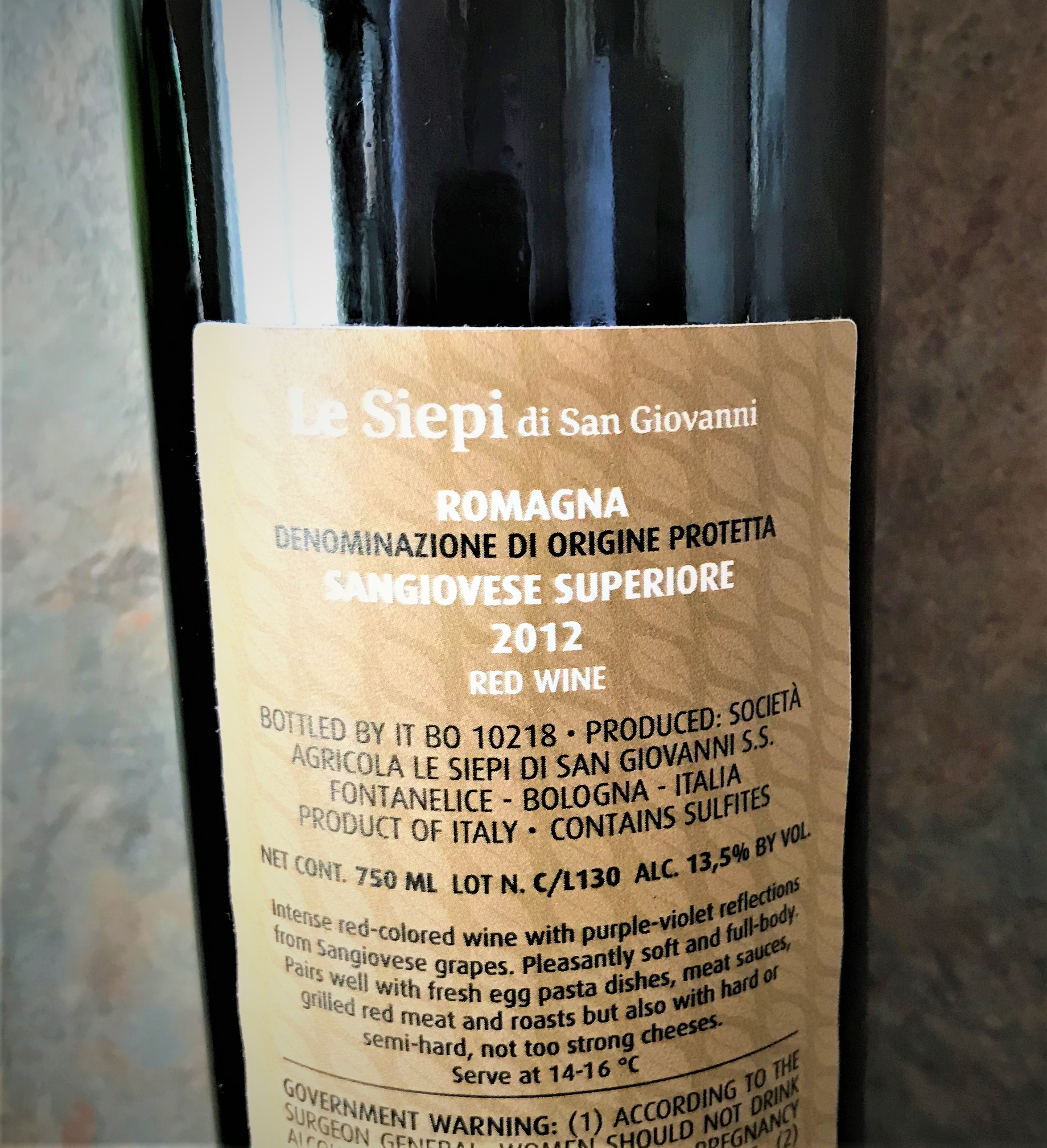 Societa Agricola Le Siepi di San Giovanni Sangiovese Superiore di Romagna DOC 2012 was the second offering for the month of August. If you are like me, you may have never heard of this wine, but the estate of Le Siepi di San Giovanni is located in the Northern Apennines in the Santerno River Valley near Bologna in the Emilia-Romagna region of Italy. The Emilia-Romagna region is big and it is the only region in Italy that has an East and West Coast. The Estate is owned by the Zuffa family and was started in 1960. The Estate is forty hectares, but only eleven hectares are devoted to vineyards. The wine is pure Sangiovese and was manually harvested. I could not find out how long the wine aged for, but I was surprised to see that it is a 2012 and I have to surmise that it has to do with the fact that it is Sangiovese Superiore (even though I cannot find any rules pertaining to it).