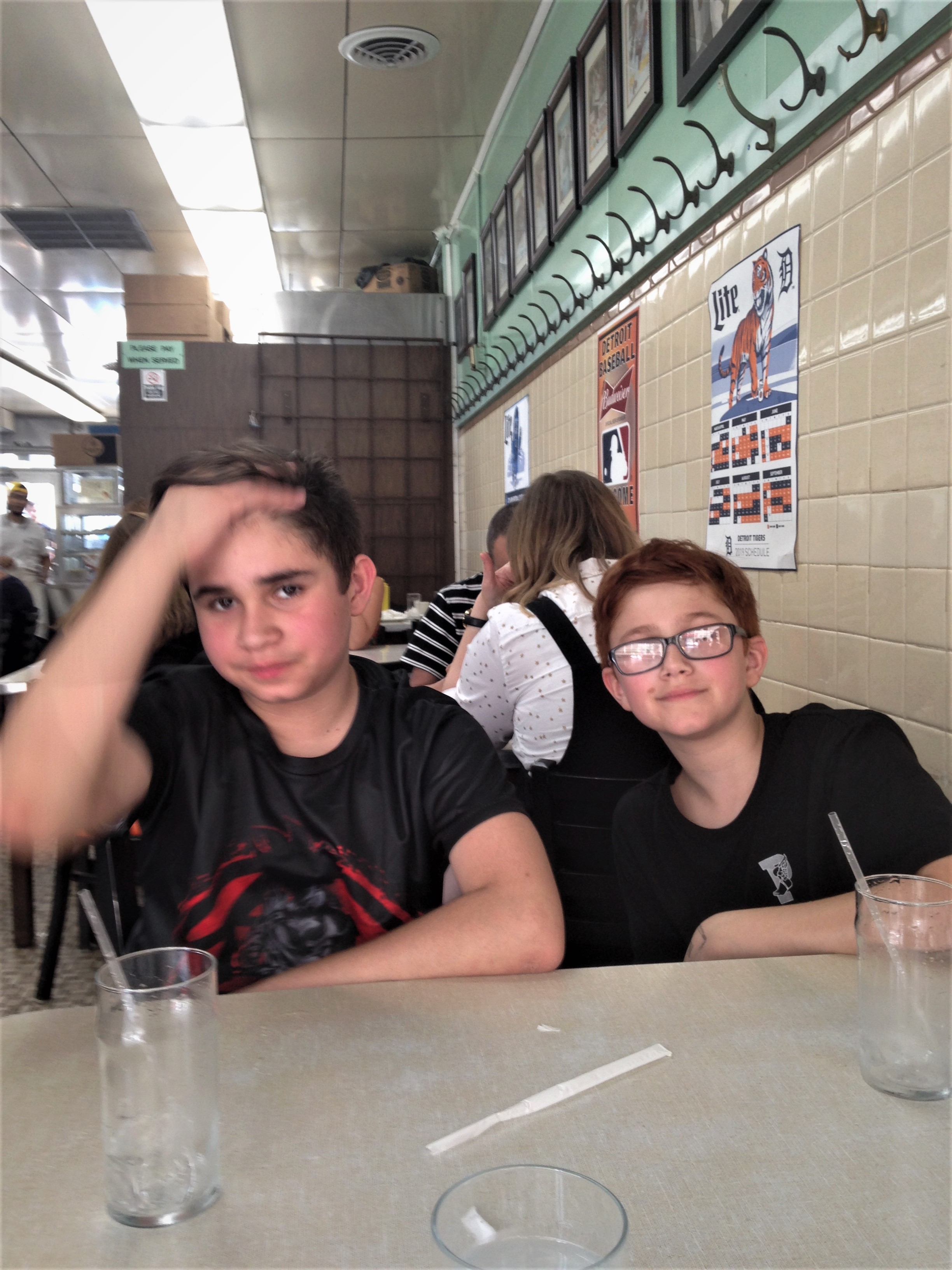 We then took them to Downtown Detroit, so that they could see Detroit with people on the streets, not as crowded as when I was there age, or as crowded as The Strip in Vegas, but people and activities and commerce.  We drove through some of the areas that are still blighted and then they also got to see how gentrification is working to save the city from the decay of just a few years ago.  They also saw what was left of the old Tiger Stadium where the field is still being used and it was that day and the businesses and condos that are now surrounding the field.  They also got a chance to see and feel the old brick road surface that is still in parts of Michigan Avenue that goes from Downtown Detroit to Downtown Chicago.  After walking around the downtown, seeing the stores, the two new stadiums and then down to Hart Plaza along the Detroit River we pointed out that across the river was Canada and the only point where Canada is south of the border.  We also took them out for dinner, in what can be the most argumentative subject in Detroit.  We were going to have Coney Islands.  If you are not aware of it, Detroit is famous for Coney Island meals, which is either a hot dog in a bun covered with a meat laden chili, onions and mustard or a Loose Burger, which substitutes fried ground round for the hot dog with the same toppings.  The kids have had second rate versions of this Detroit delicacy that they tried with their Mother in Dearborn, and I took them to try one at the D Hotel in Vegas, but it was a very poor imitation.  Side by side in Downtown Detroit with entrances on both Michigan Avenue and Lafayette Street are American Coney Island and Lafayette Coney Island and here is where the battle will begin.  When I was a kid, the two restaurants were owned by brothers and the employees between orders would step out on the sidewalk and twirl their towels in the air and try to persuade customers to enter one eatery rather than the other (and I may add that it was all in good fun).  American Coney Island is a beautiful emporium that has expanded into the old United Shirt Factory store and has updated and remodeled a couple of times and they have expanded the menu a couple of times; whereas Lafayette Coney Island is the same dingey diner with the same counter, some long community tables and a few smaller tables and the only addition to the menu was when they added French fries.  You guessed it, we ate at Lafayette, I mean give me a break, American has salads that they introduced to entice the Yuppies, the only thing I think Lafayette did was get a better refrigerator, because the beers seem colder.  The boys even were amazed at the quality of the hot dogs, they couldn’t put it into words, but a Detroiter will tell you that real Coney Island hot dogs snap when you bite into them.  I may get chastised for my selection, but I stand by it, as I have been going to Lafayette, even before I was going to school.