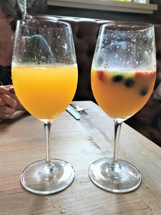 We went inside and got a table, because they would not take a reservation for less than a party of eight and we only had six. My Bride and I got there before the kids who live closer, so that was good, so we could make sure that we were guaranteed that the tab would come to us. The interior was gutted right down to the bare brick walls, so one would never realize that it was a bank until one saw the vault with the big door swung open and two tables were inside of it, with a chandelier hanging overhead from the exposed ceiling. The immediate appearance of the restaurant conveyed casualness as the chairs and tables did not match and neither did any of the utensils, in fact it caused a bit of consternation for our one grandson, as he did not want to use a salad fork to eat his meal, so his one sister changed forks with him, so that she ended up with the largest butter knife and the smallest fork at the table. The brunch menu was small, but well thought out and reminded my Bride and I of our favorite place for brunch in Las Vegas. My Bride saw that they had Lemon Souffle Pancakes with Ricotta cheese, berries and raspberry syrup and she also ordered one poached egg ala carte and that is the dish she invariably orders when we have brunch in Vegas. I ordered the classic version of Eggs Benedict with the peameal bacon, poached eggs, English Muffins, Hollandaise Sauce and breakfast potatoes and I also ordered a side of sausage patty, but I ended up with sausage links as I was told that was all they carried anymore. The rest of the crowd ordered their dishes and I had to watch my grandson eat his order of the Eggs Benedict by making the two halves combined and devoured as a sandwich and it worked for him.