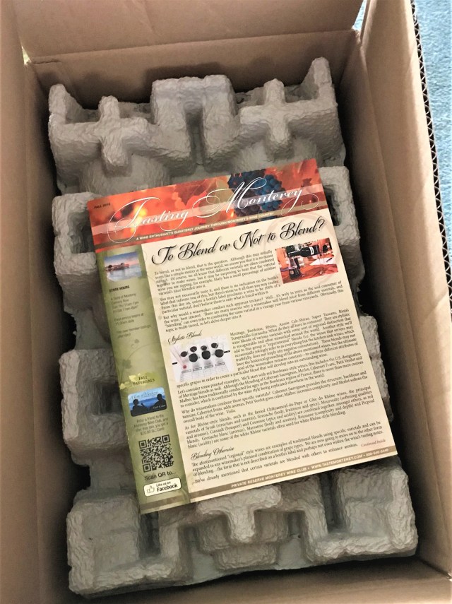 It has been a busy wine time here at the house and the quarterly shipment from A Taste of Monterey arrived and it took a couple of days, even to open up the carton. We have been getting shipments from this club since we discovered them on our first holiday at Carmel-by-the-Sea and we went to eat at the legendary Sardine Factory in Monterey. Between the meals, art and wine it was a very expensive, but very enjoyable trip for us. The gallery tried to buy the art work that we bought, a couple of years later, but we like it hanging in our living room, so that everyone can see it, we then walk into the house. We signed up with the Private Reserve Club, which come quarterly, they have other clubs that come monthly, but they are more popular price and we really wanted to get some wines that we would not encounter otherwise.